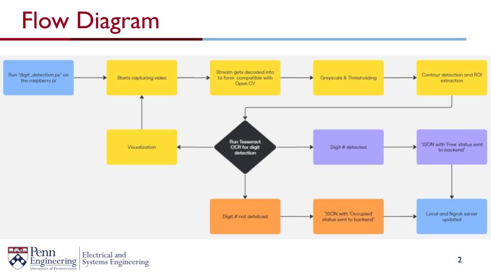 We will utilize a raspberry pi and image recognition with a camera to detect whether a parking spot is empty or full. This data will be displayed in an LCD screen as well as an IoT dashboard on a mobile device.