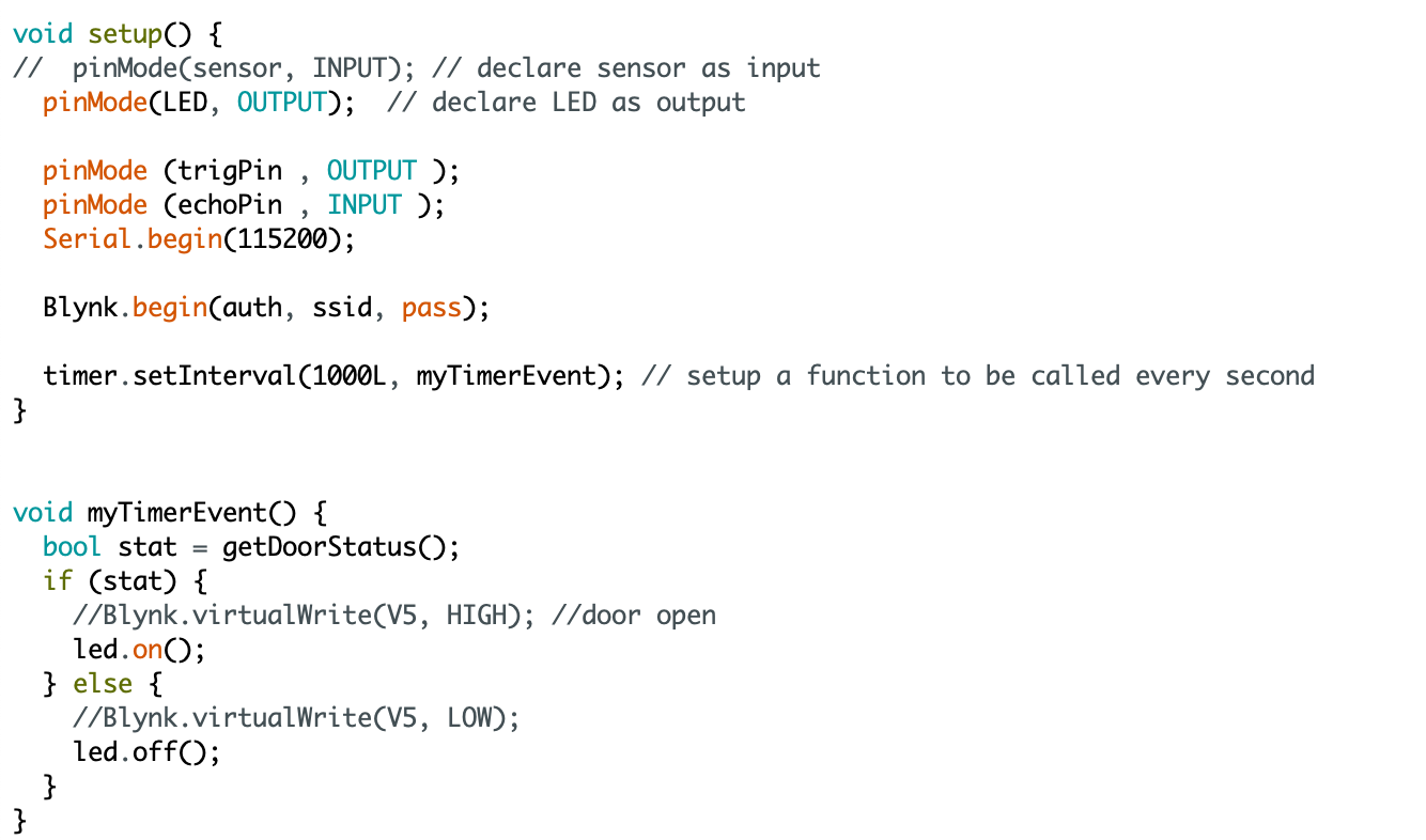For the next step, we use the ping sensor to sense the motion of the door by measuring its distance from the sensor. Similar to the light measurement, we also use a variable to keep track of the old distance to compare with the new distance. If there is a difference that’s greater than 5 and the light difference is already triggered, then it will update the door status to be either close or open depending on its current status. This will then trigger then LED light and send a signal to your phone. You can find more details on this function in the code snippet in the attached photos.