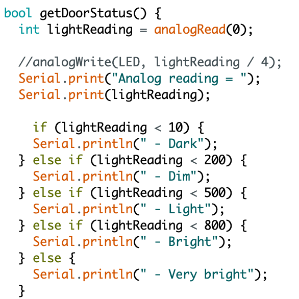 First part of the main function getDoorStatus(). This detects the light reading measurement and update its status accordingly..