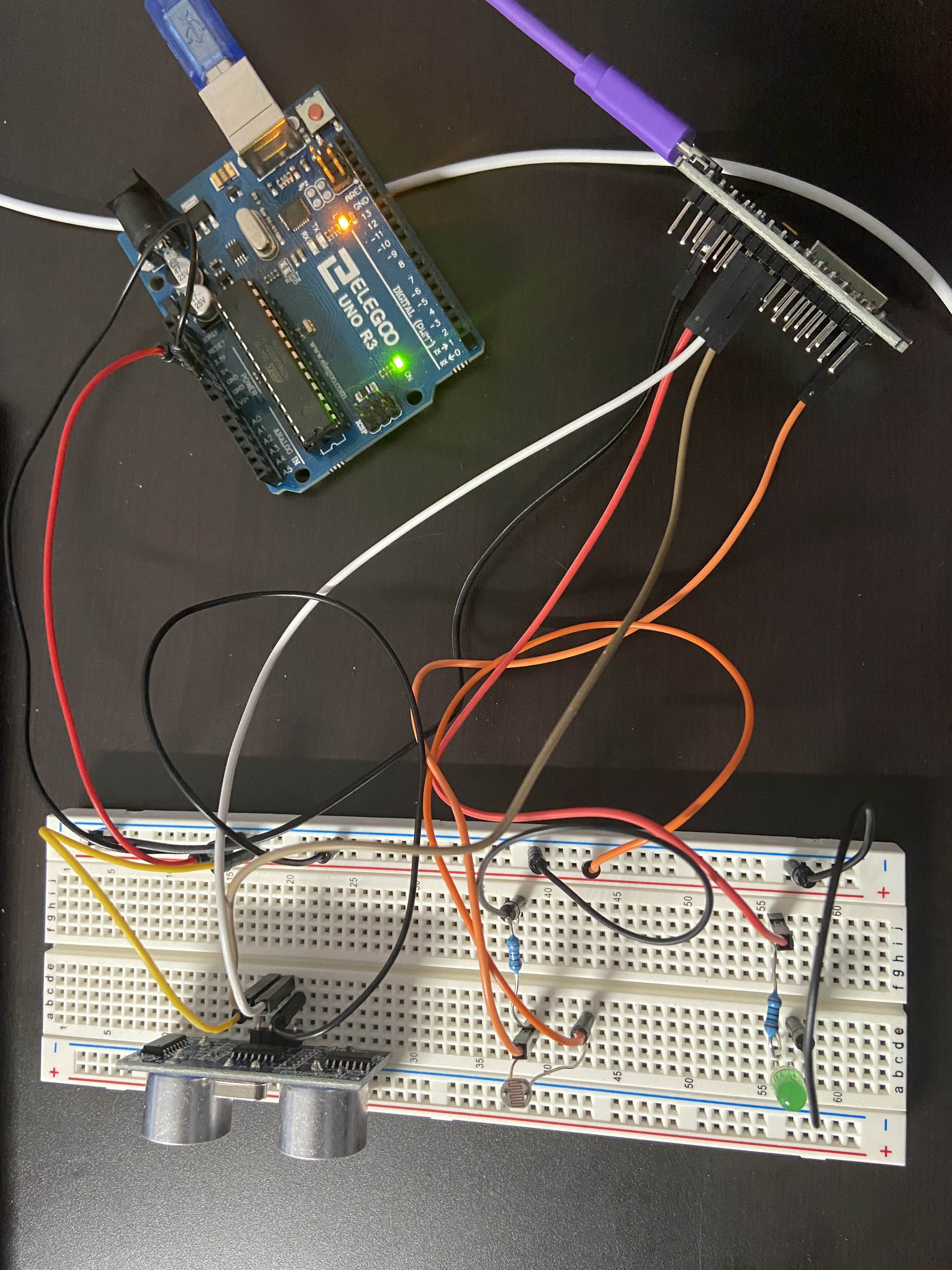 We used the light sensor and the ping sensor together to detect the door motion as a fail-proof measurement (since both have to sense a difference to indicate the change of the door status). We used Arduino to build it, and more details on the board design and the code can be seen in the photo.