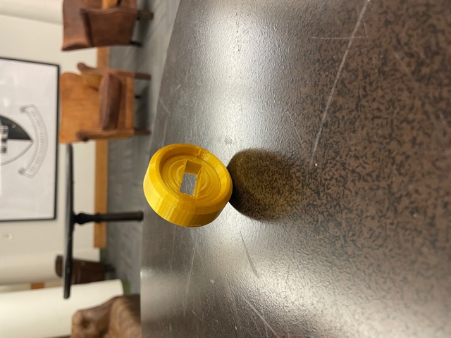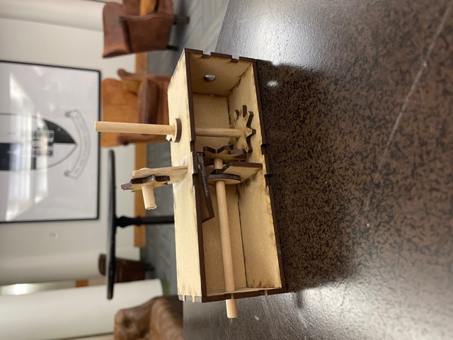 A cutout of the sun on the Cam-follower oscillates up and down. A clock hand rotates as the shaft is turned. The plate for the cam follower was a bit too long which created a moment arm that pushed the follower at an angle.