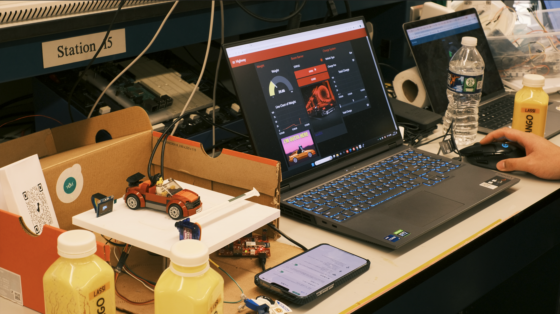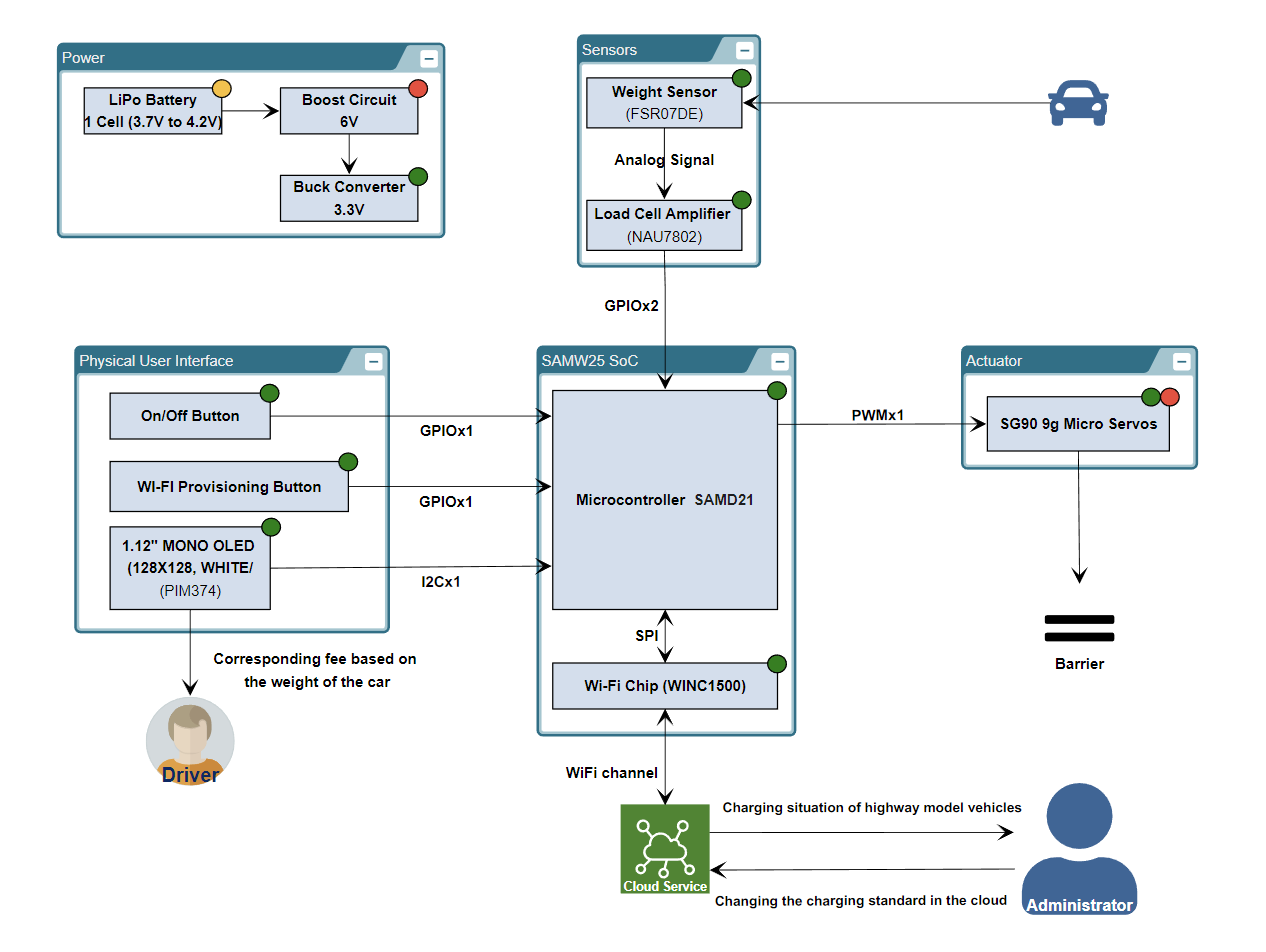 The inspiration for this IoT Highway Toll Station model comes from real-life highway toll stations. With the development of IoT technology, automated and intelligent systems are increasingly being applied to various scenarios to improve efficiency and convenience. In this model, by using a weight sensor, servo, and OLED screen, it can automatically detect the vehicle's weight and display the corresponding toll in real-time, which enhances the working efficiency of the highway toll station. Additionally, users can view the charging situation of the model vehicles on the web, increasing the transparency of information. The overall inspiration behind the design is to apply IoT to real-world problems and enhance user experience.