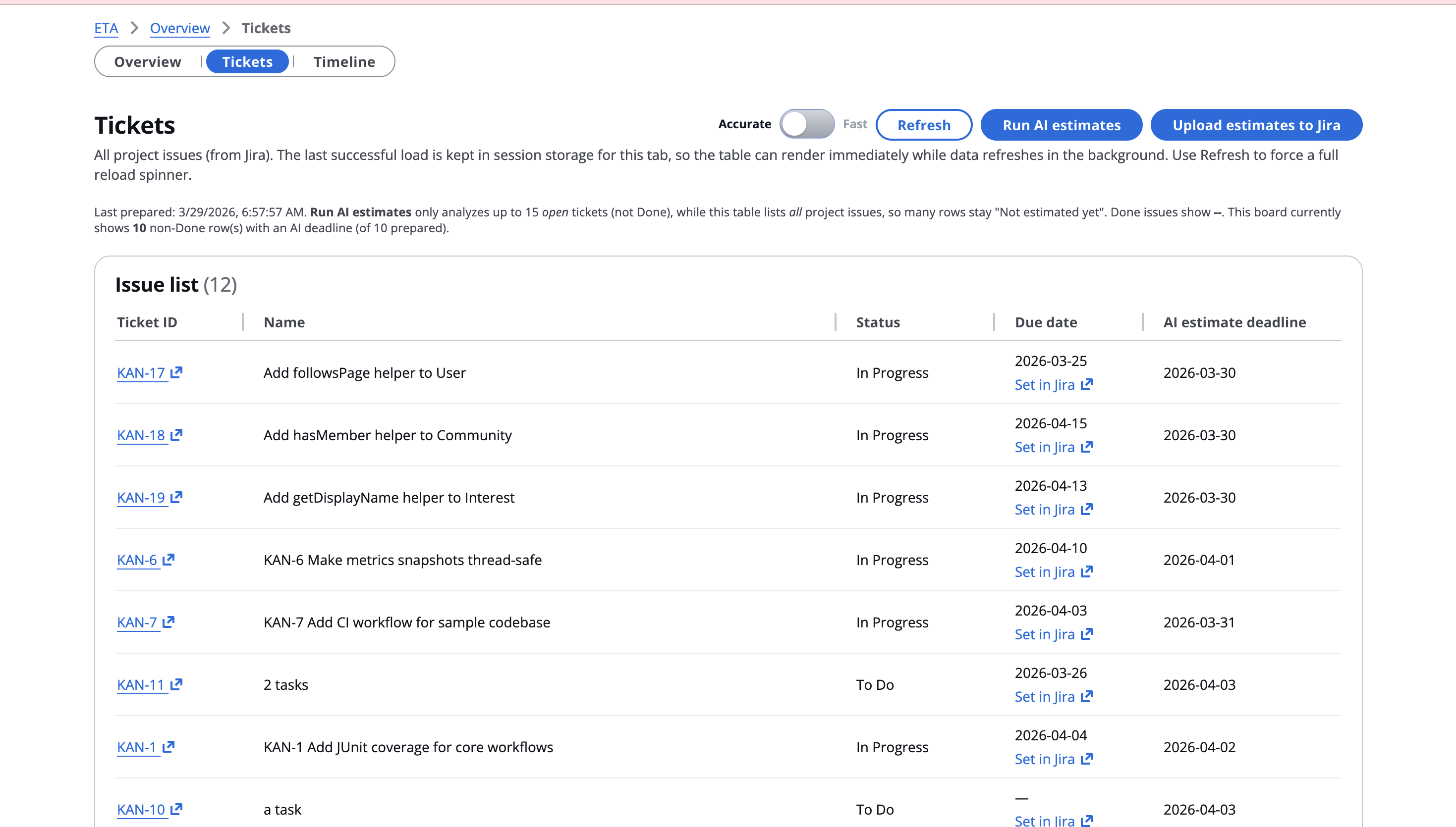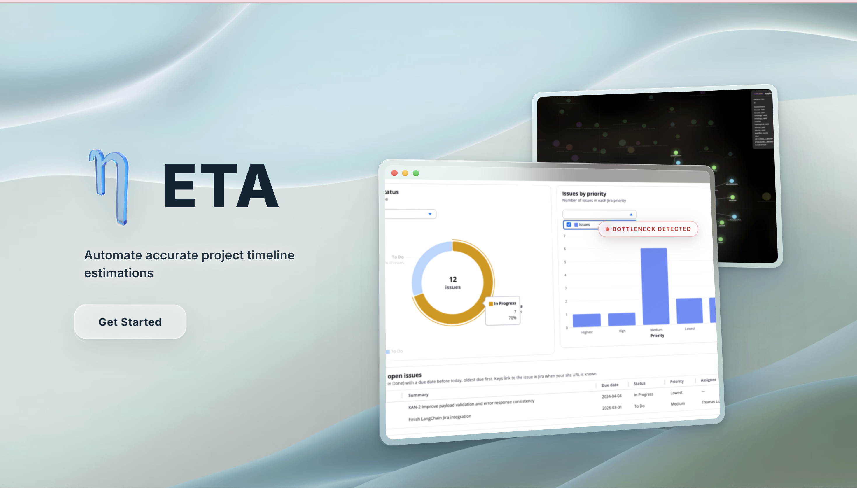 Rather than performing tedious, 'gut-feeling' estimations for task due dates in Jira, ETA deploys agents that analyze Jira ticket parameters and the relevant portion of a repository to create accurate suggested times. The repository is converted into a knowledge graph, allowing an agent to easily find the nodes relevant to a ticket and its dependencies. The graph also assists as a UI feature, allowing PMs to see task dependance on other nodes, or how reliant other nodes are on a ticket.