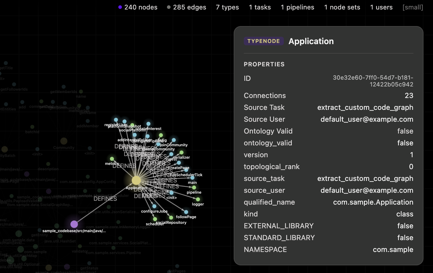 To support large-scale repository reasoning, we use Cognee to ingest repo code and construct a knowledge graph over the codebase. In this graph representation, entities such as classes, functions, interfaces, and modules are modeled as nodes, while relationships such as CONTAINS, CALLS, IMPORTS, and EXTENDS are modeled as edges. This converts the repository from a flat collection of text into a structured graph outlining the dependancies.