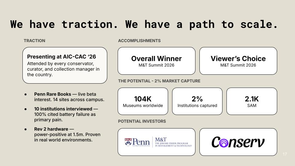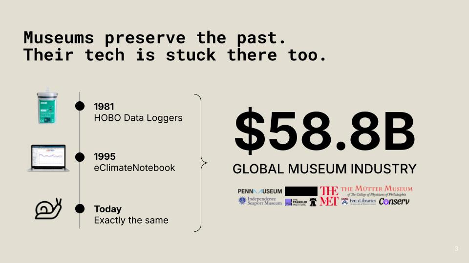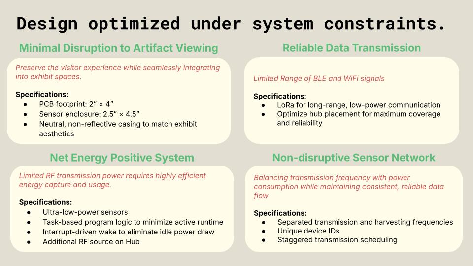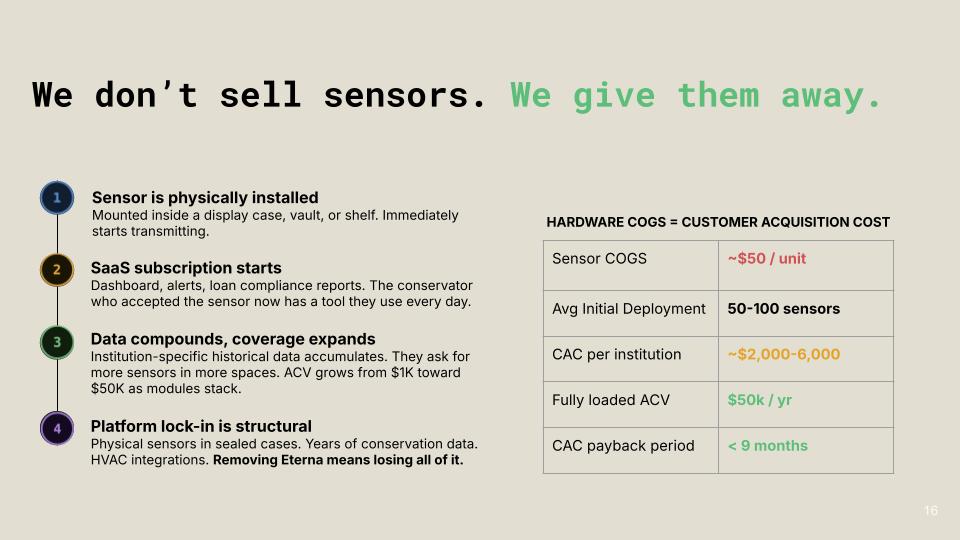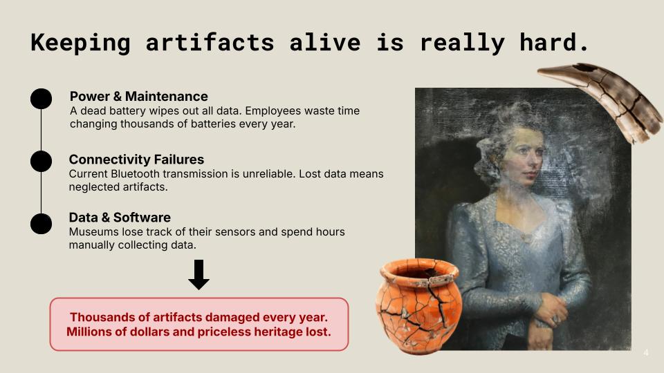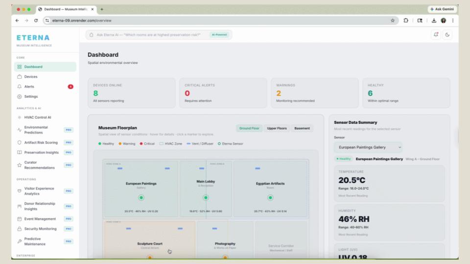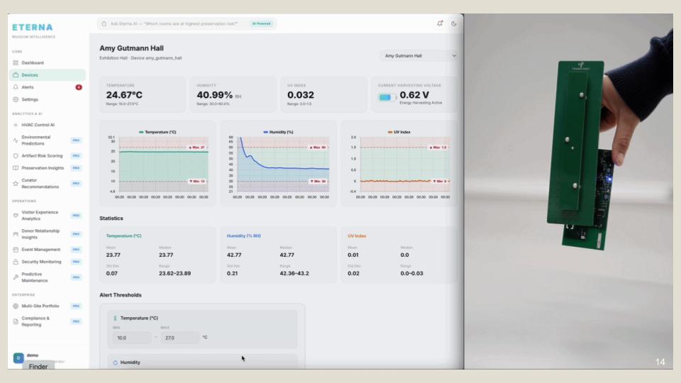 Eterna is a batteryless, ambient-powered sensor system that provides continuous, artifact-level monitoring without disrupting the delicate environments of museum collections.