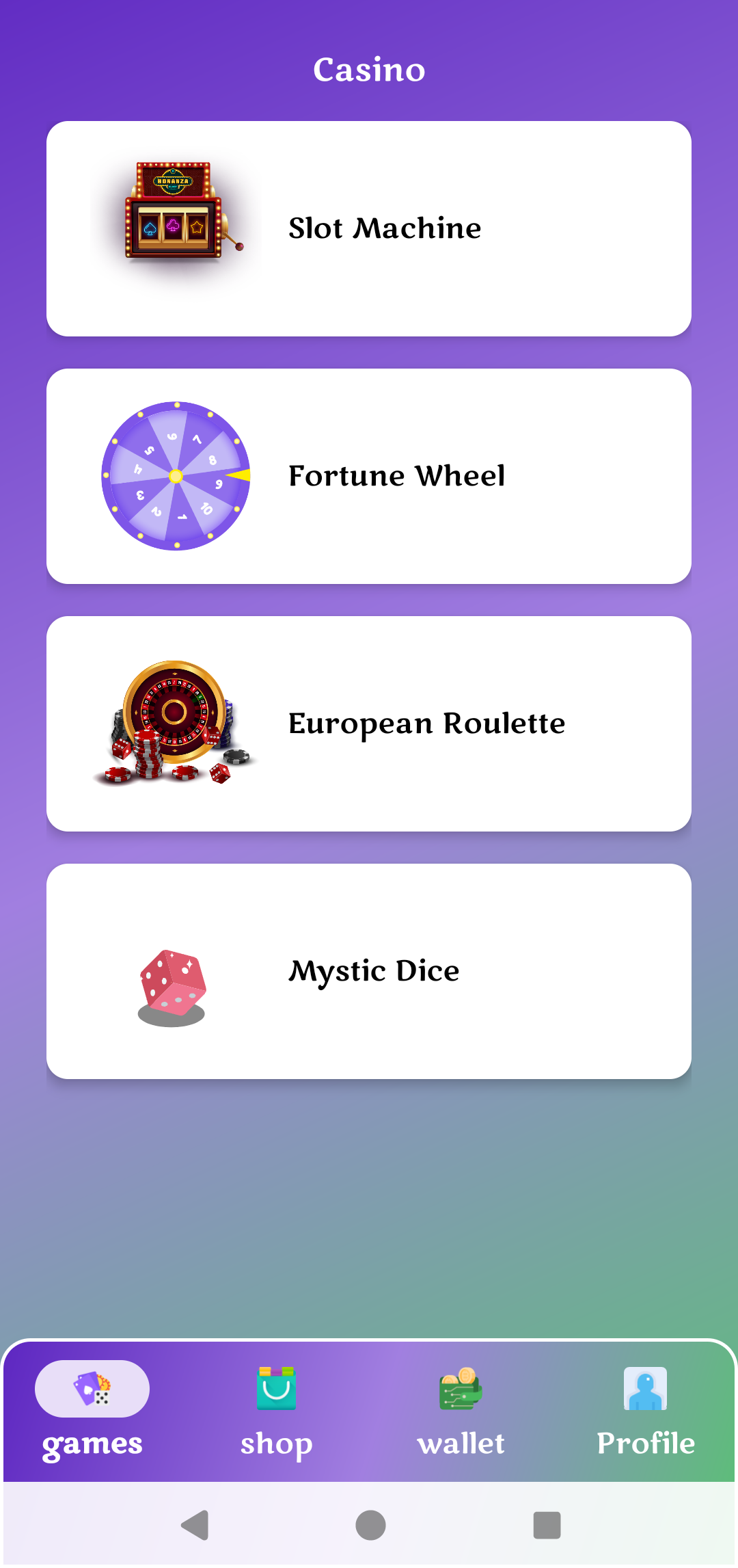 I aim to enhance the smart contract architecture by making it more modular. This will involve splitting the logic for different games into separate smart contracts, allowing new games to be added without the need to update the backend contract or migrate data, ensuring flexibility and scalability.Improving Visual Appeal of the Android App 🎨📲