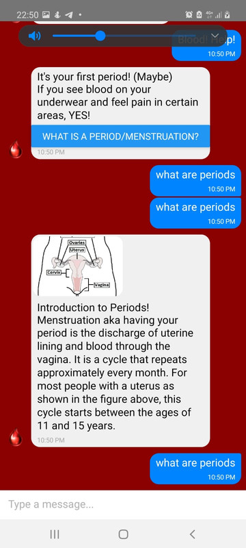 Our solution is an informational chatbot built into an android mobile application. Our bot serves the purpose of educating people of all ages about commonly asked questions related to periods. It assures them that conversations surrounding periods are welcome in our community and helps them understand all about menstruation. The users can also ask it questions and chat about their period problems.