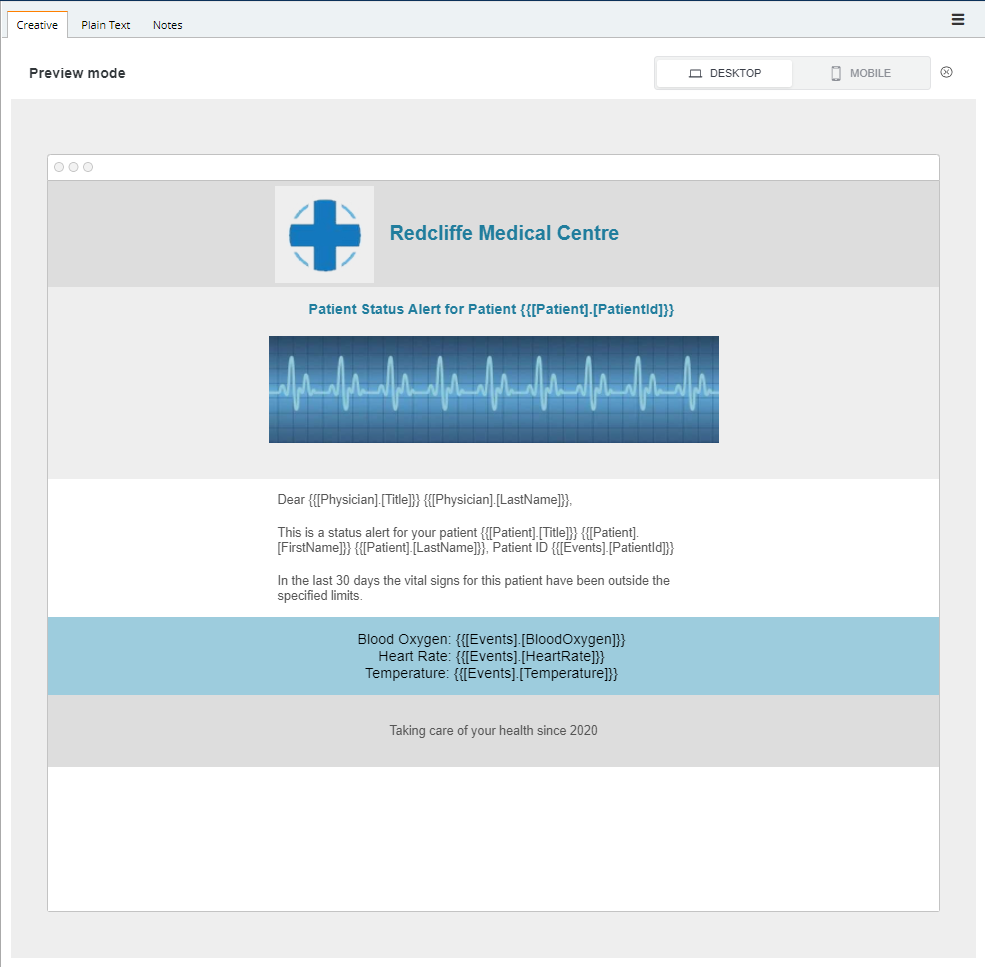 Template email notification to a doctor or medical team from BlueVenn