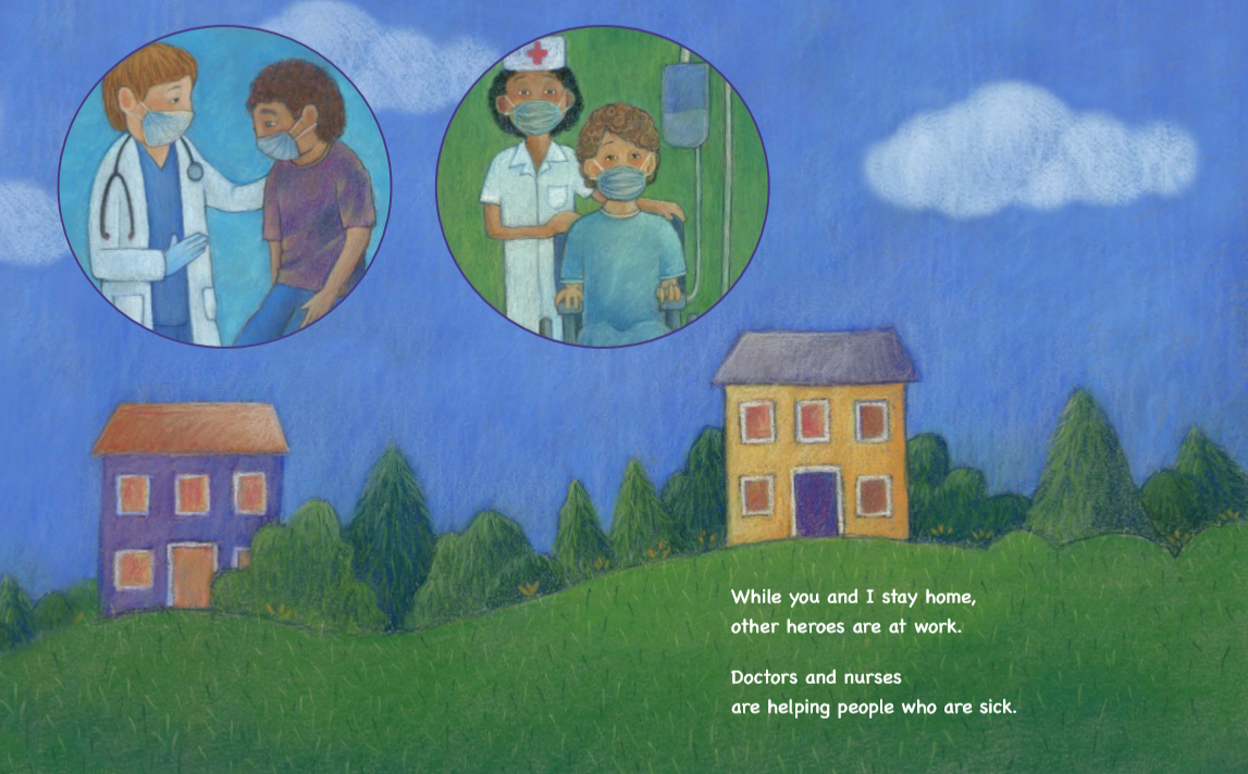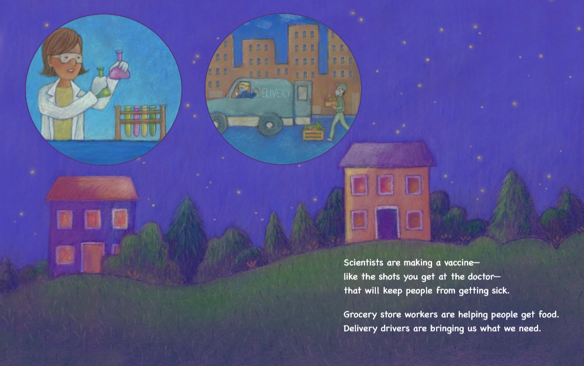 I wrote a first draft of this story by drawing from CDC's website for talking to kids about COVID-19. Then, I shared the story with my picture book critique groups several times to ensure it was emotionally engaging as a children's book and then with public health professionals to ensure accuracy in the prevention messaging. I then read the story to my kids and asked friends read the story to their kids to gauge their interest and reactions. Then, I began working with a professional illustrator, Laurie Smollett Kutscera, to create the final product. Together, Laurie and I honed the text and discussed the most appropriate images to accompany the story and reinforce the prevention messages. Then, Laurie completed 22 illustrations in pastel pencil in 7 days (an amazing feat!). She then edited the images on a computer and laid out the text.