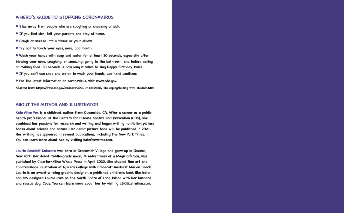 I'm proud that this story addresses both children's emotional and public health questions in one consistent, engaging narrative. I’m also proud to combine eight years of CDC experience with two years of experience as a professional children’s author. This project feels like the culmination of many of my work and personal life experiences. Laurie is very proud of completing an entire picture book's worth of illustrations in under a week (a process that usually takes months or even a year). We are both very proud of the finished product and hope it helps kids who are seeking information and comfort in this difficult time.