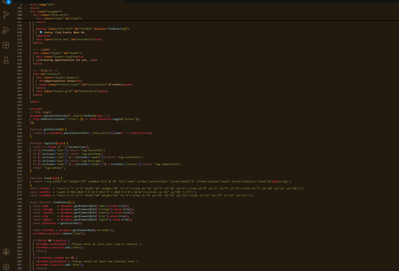 HTML / CSS / JavaScript — frontend interface with dark theme UI Gemini AI API — generates personalized event recommendations Smart Filters — 20 interest chips covering AI, ML, Civil, Biotech, FinTech, Design and more Location-Based — filters events by city, region, and country