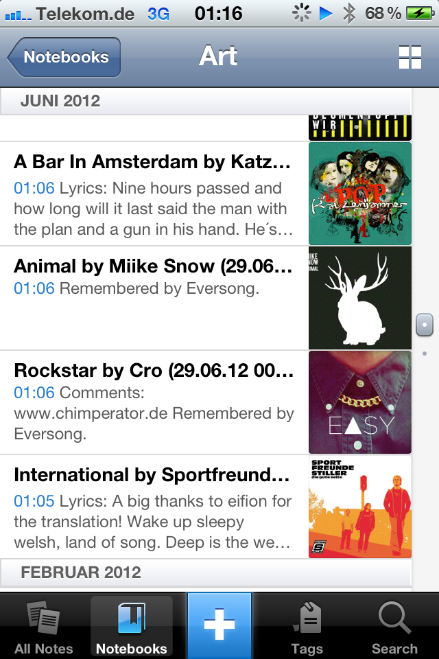 Eversong helps you to remember your music moments. When you listen to a song on the iPhone or iPad you can use Eversong to create a note including the lyrics and the artwork. All your song notes can be automatically posted to Evernote. So all your memories are in one place!
