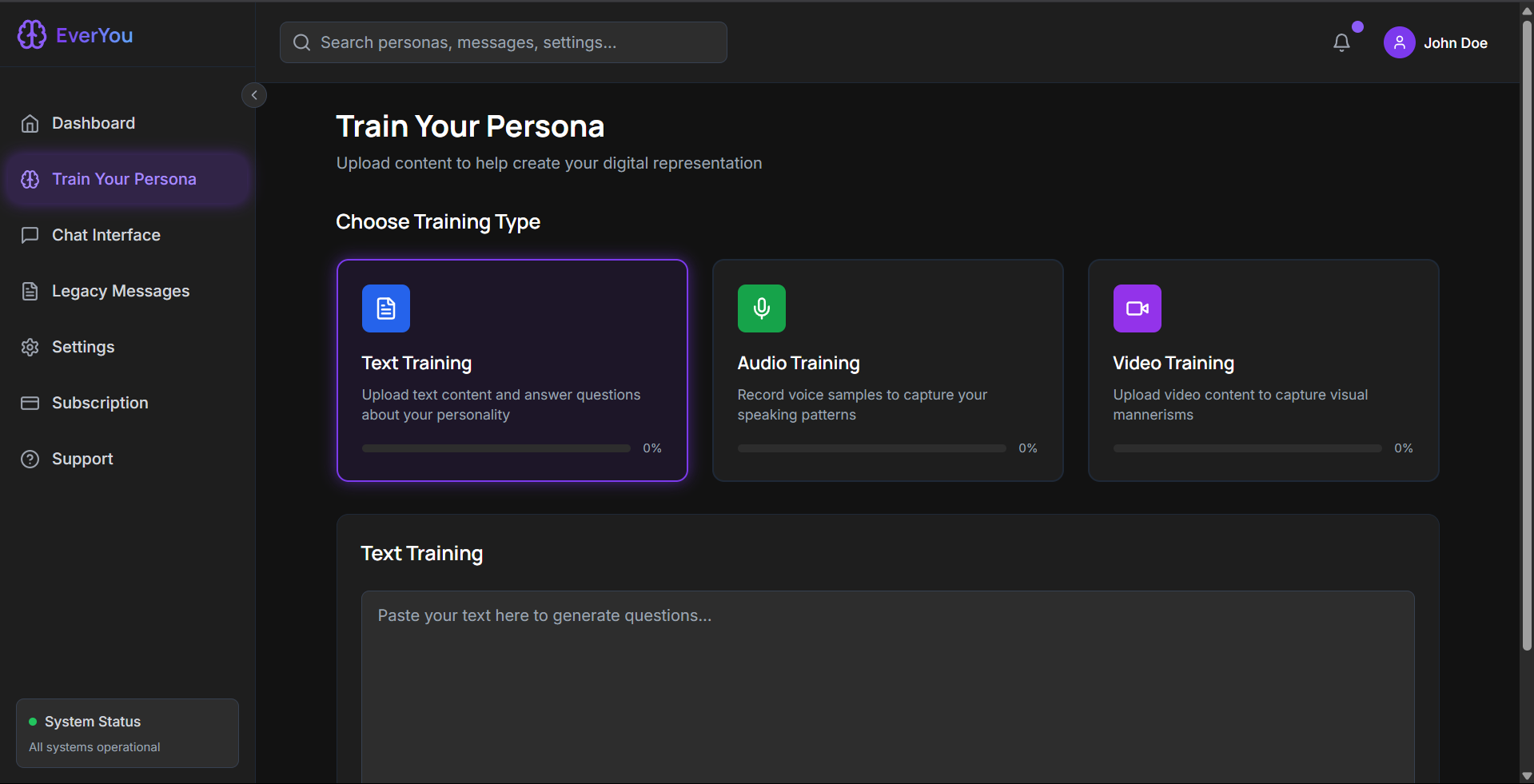 The loss of a loved one often leaves behind unanswered questions and unspoken words. We wondered: what if you could preserve your presence beyond life—not just memories, but voice, face, and personality? Inspired by this emotional gap, EverYou was born to bridge it using AI.