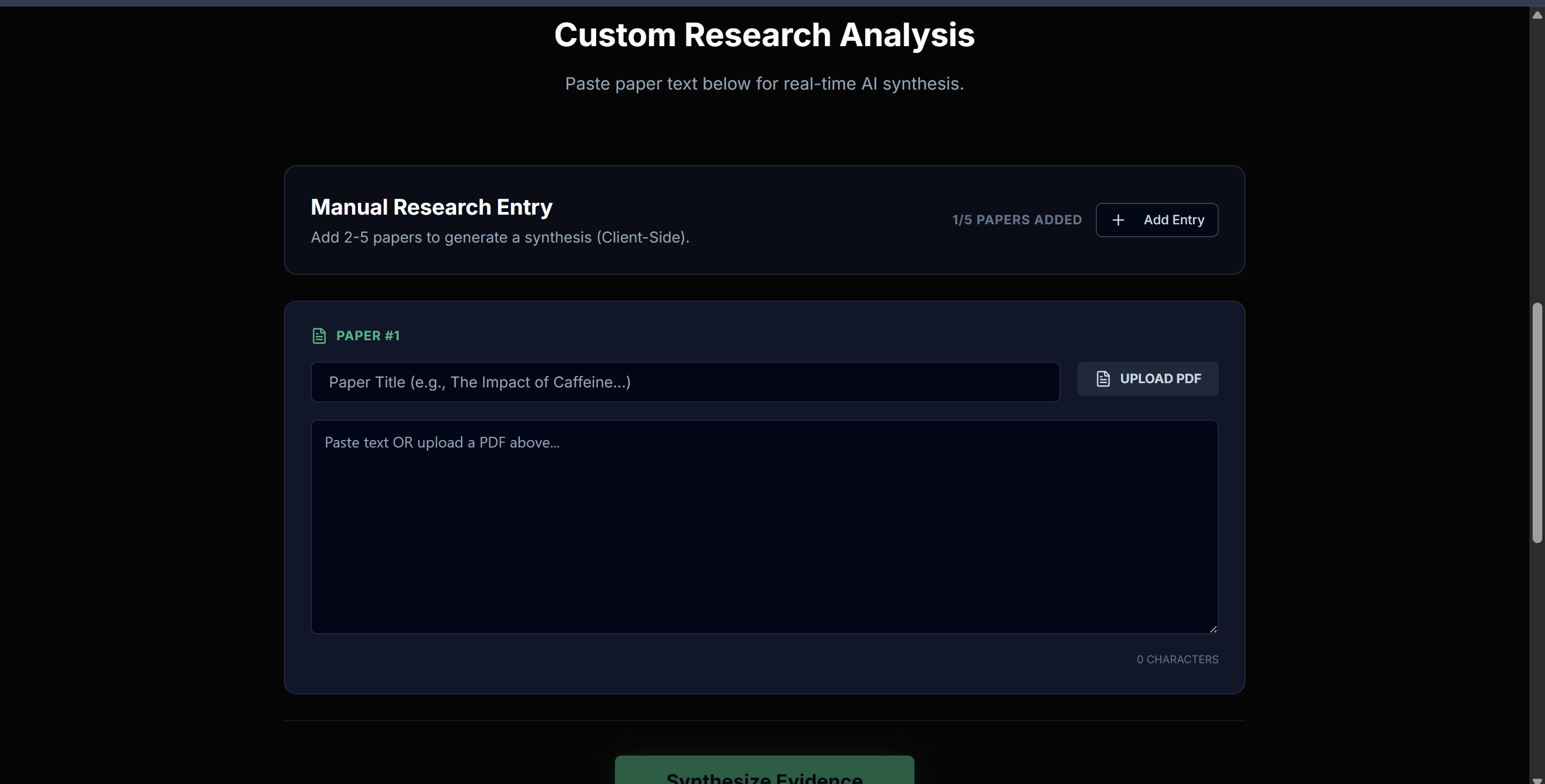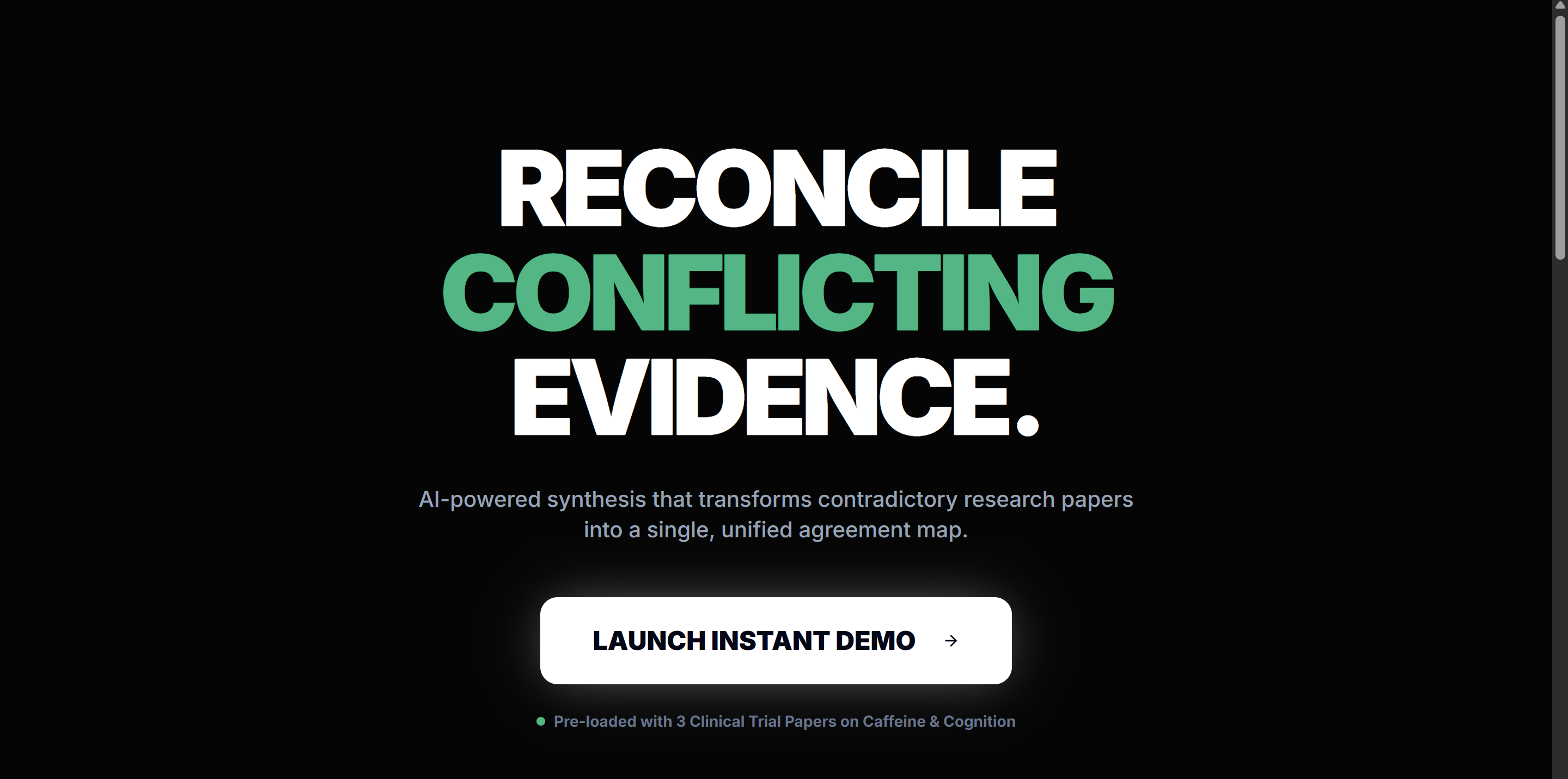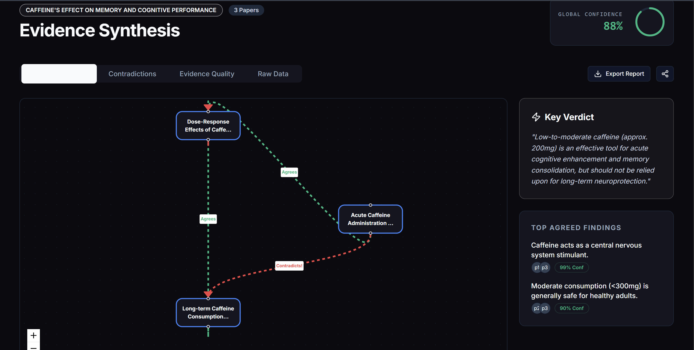 Every day, 7,000 new research papers are published. By the time you finish reading this sentence, another paper just dropped. Here's the nightmare: most of them contradict each other. One study says caffeine boosts memory. Another says it does nothing. A third says it only works if you're sleep-deprived. Scientists, policymakers, and journalists are drowning in information but starving for intelligence. Existing tools like Perplexity retrieve text. They don't resolve conflicts. They don't explain why studies disagree. They don't tell you which evidence to trust. We built EvidenceSynthesis because we were tired of "it depends" being the only honest answer to complex questions.
