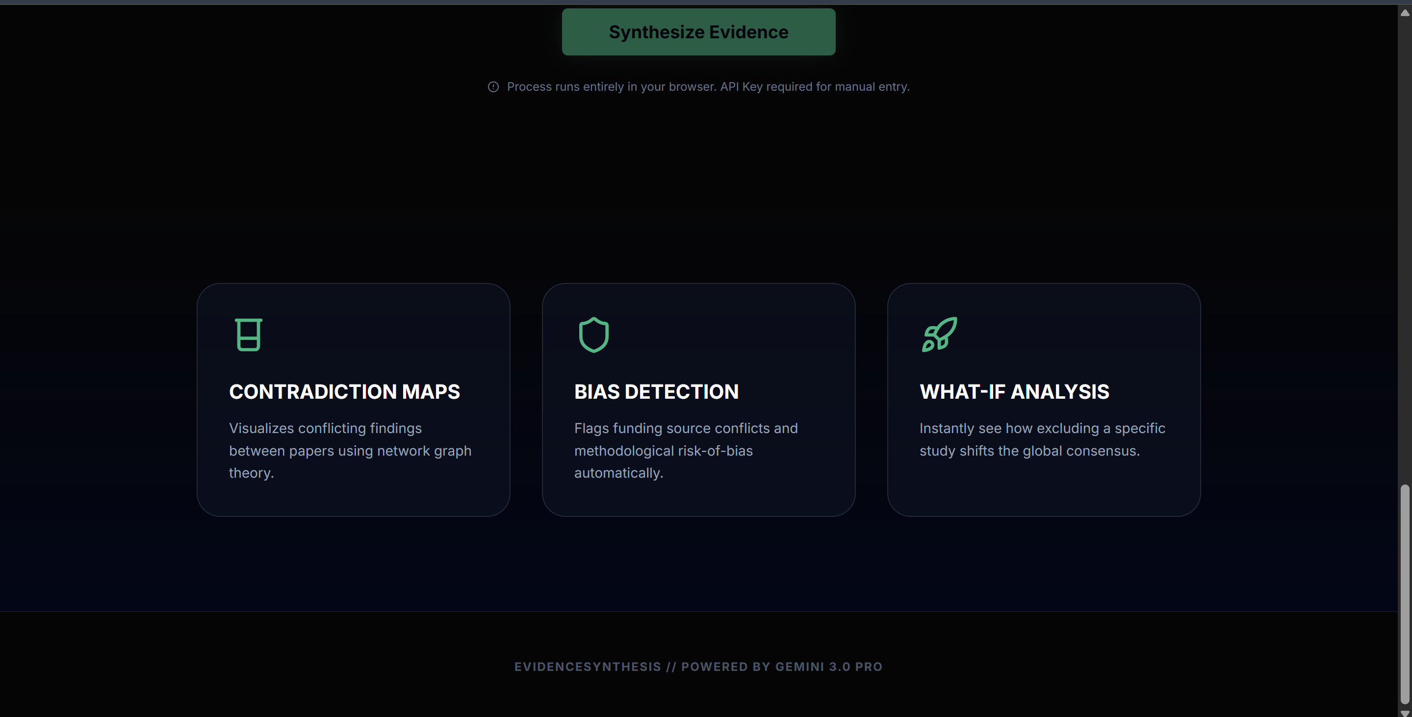 EvidenceSynthesis is a research intelligence platform that performs cross-document reasoning with explicit uncertainty quantification. Upload 2-5 research papers on any topic. Our system: Reads like a researcher — Gemini 3.0 Pro natively understands PDFs including text, tables, figures, and scanned pages (not just OCR) Detects contradictions automatically — Identifies when studies make opposing claims on the same outcome measure Explains root causes — Tells you why they disagree (different populations, methodologies, measurement biases) Quantifies uncertainty — Confidence scores for every synthesis step, sensitivity analysis showing how conclusions shift when specific studies are excluded Visualizes evidence consensus — Interactive Agreement Map showing which papers agree, which conflict, and why The "What If" mode lets you remove studies in real-time and watch confidence levels change. This is sensitivity analysis no existing tool provides.
