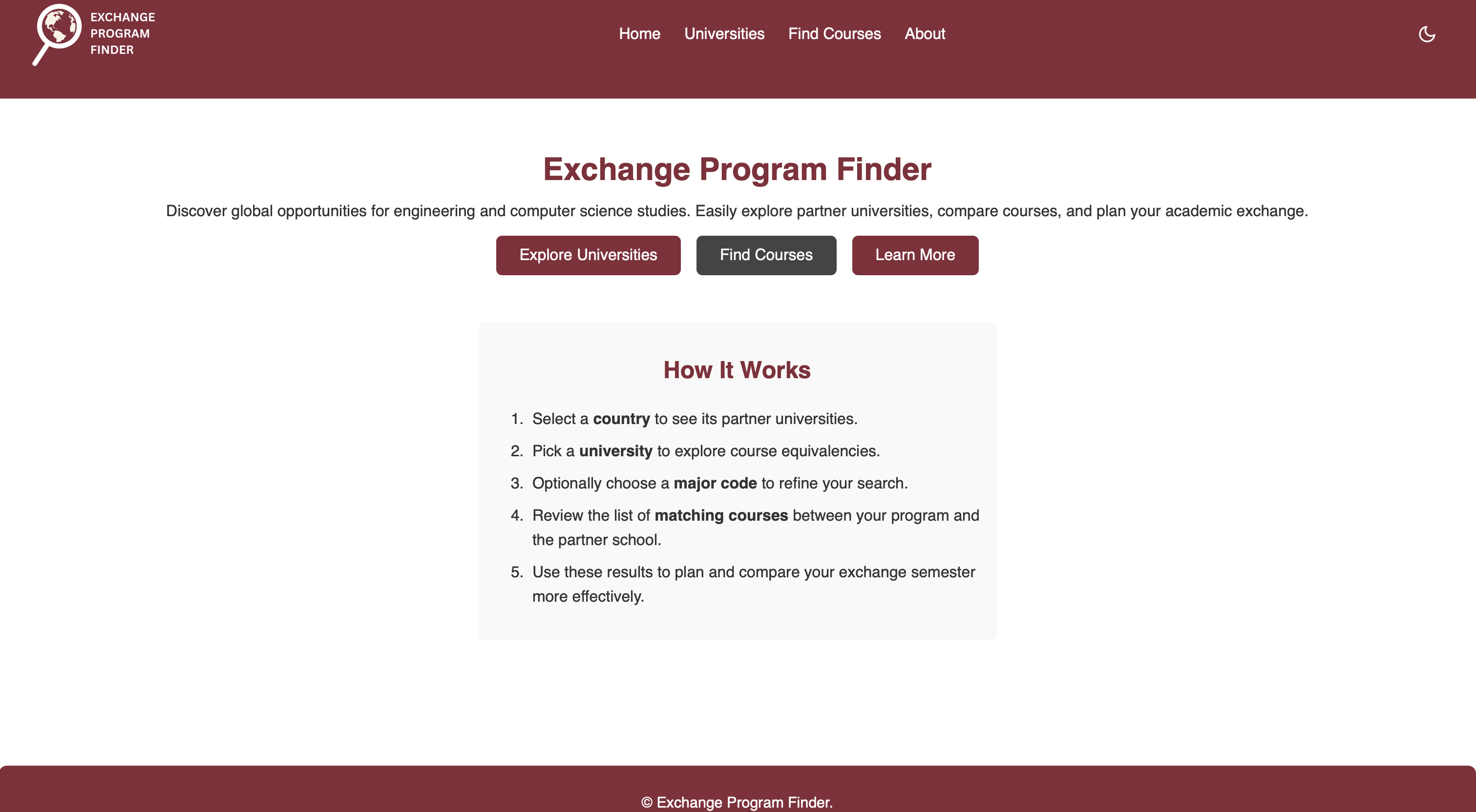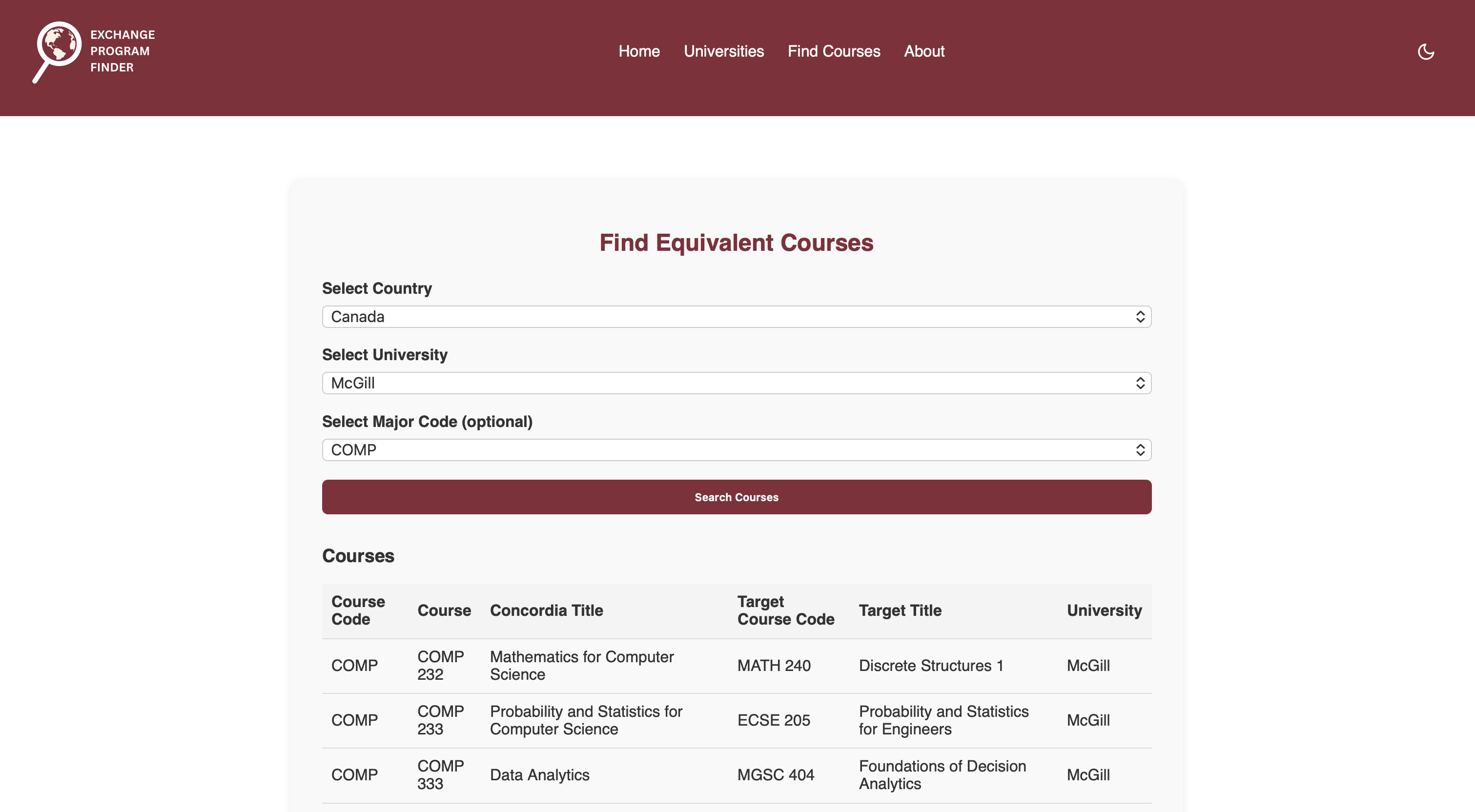 As a Concordia engineering student, planning an exchange felt overwhelming. Information about partner universities was scattered across multiple websites, and figuring out which courses would transfer back required tedious cross-referencing. The goal was to simplify this experience, not just personally, but for every engineering and computer science student planning to study abroad.