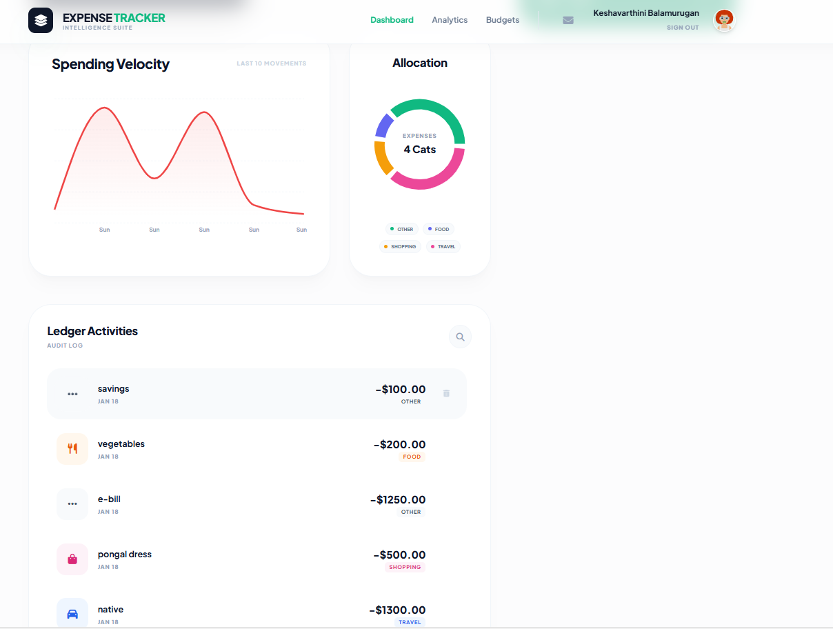 Our project, Student Expense Tracker, is a web application that allows students to: Add, edit, and delete expenses in real-time Visualize spending with analytics and category-wise charts Set budgets for categories like food, transport, and study materials Interact with a chatbot to answer quick financial questions, e.g., “How much did I spend on snacks this week?” The app is student-focused, designed to be intuitive, visually clean, and practical.