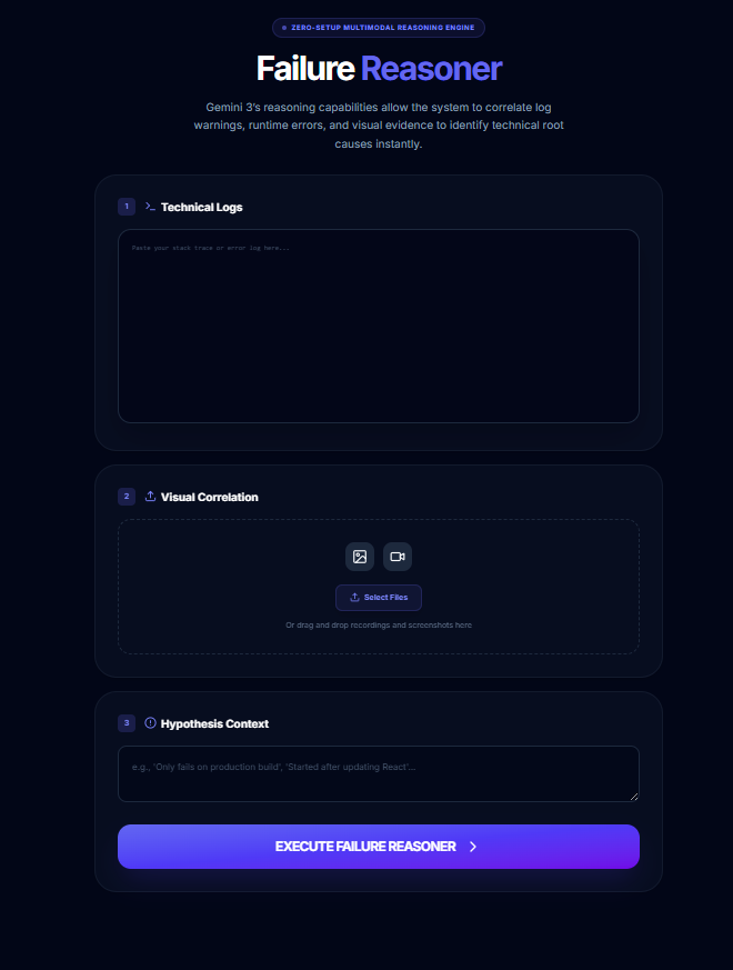 When something breaks, understanding why it failed is often harder than fixing it. Logs, screenshots, and error messages live in different places, forcing people to context-switch and manually re-explain failures to external tools. This project was inspired by the idea of reducing that friction by letting AI reason over all failure signals at once.