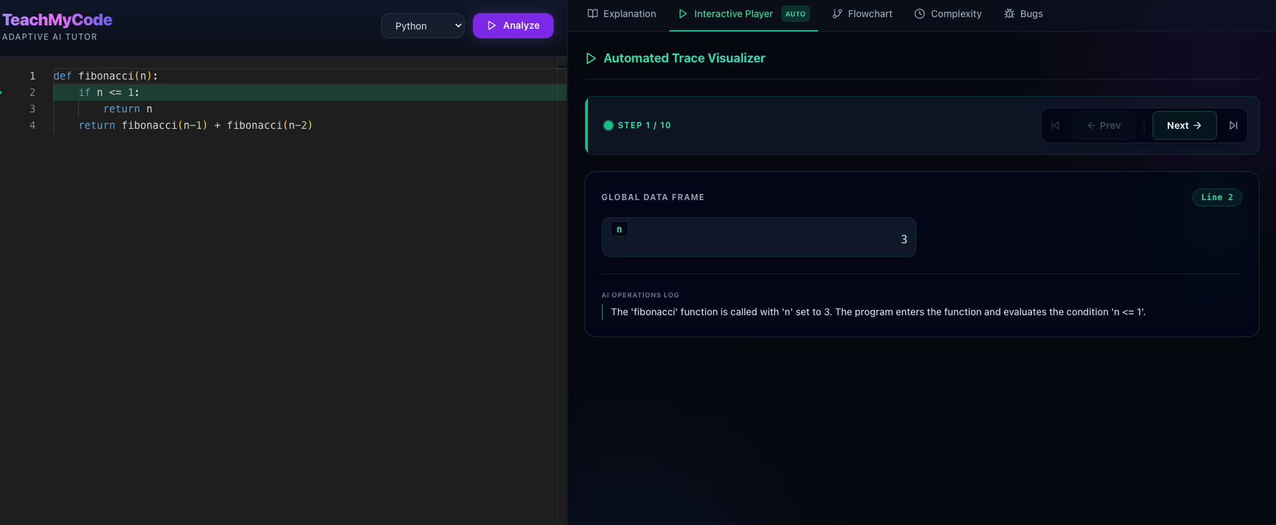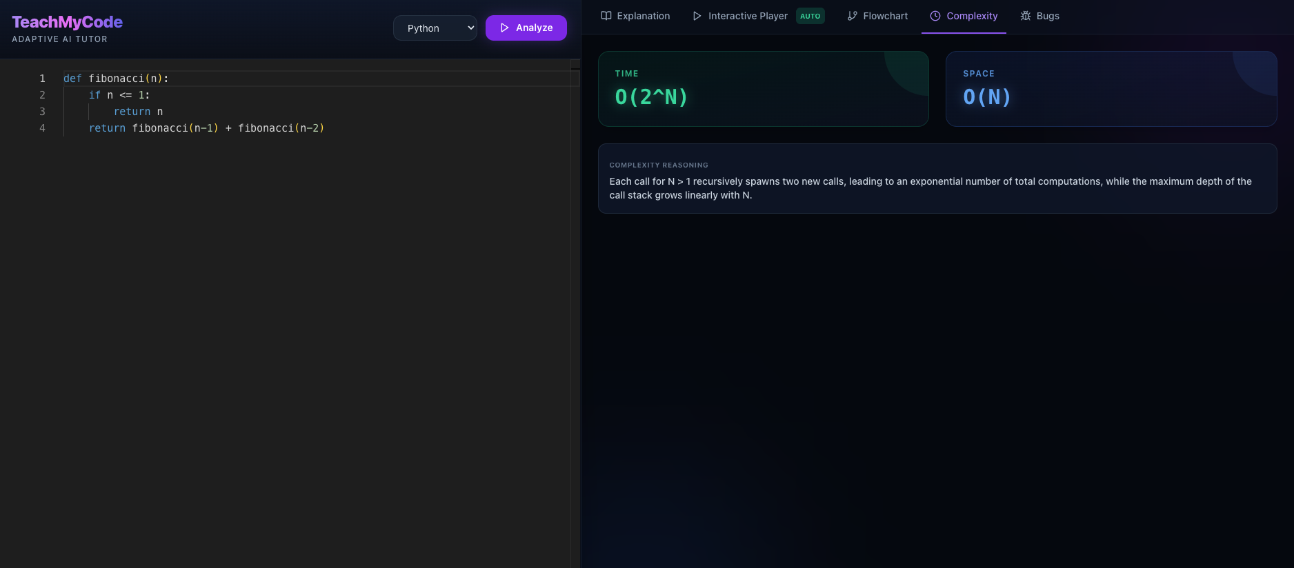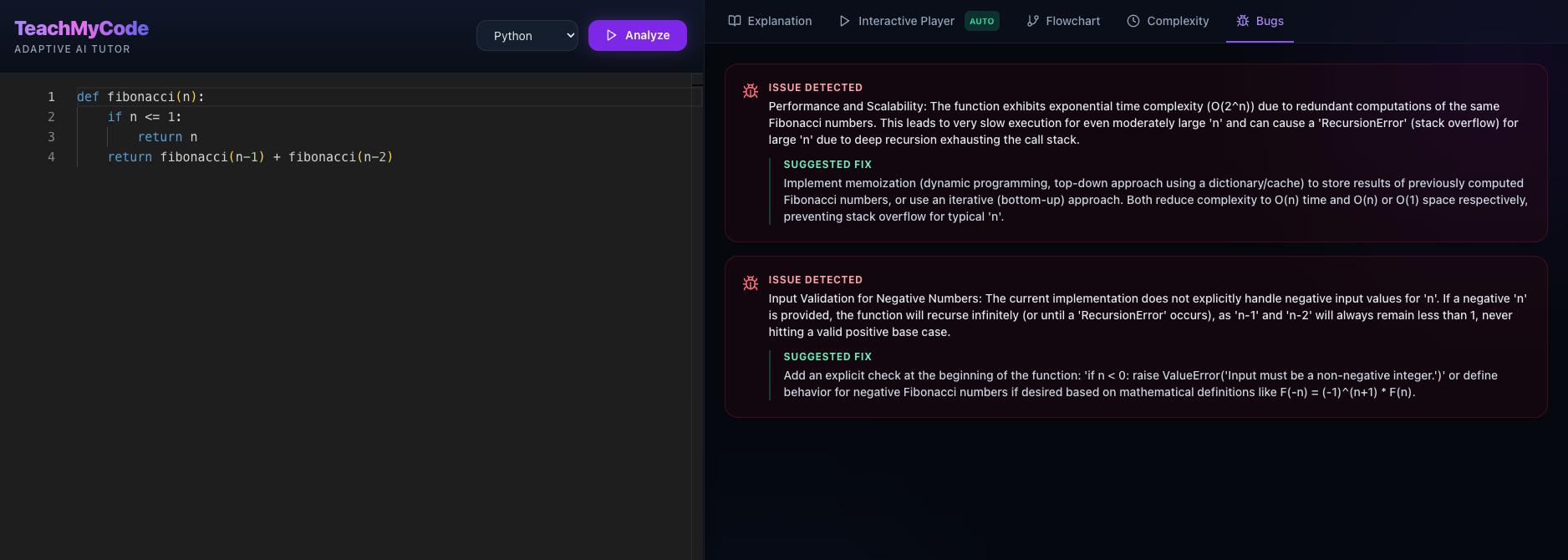 My project exactly solves this problem by first providing us an explanation for the code on a beginner, intermidiate and an expert level. After this we can trace the code by ourselves to understand it better. Then it also gives us a flow chart to understand the flow of the code .It gives us the tie complexity and suggestions to improve it.It also provides us with a bugs tab