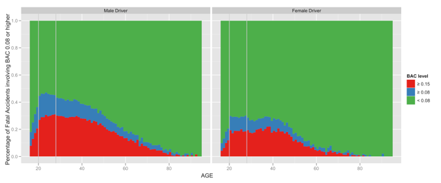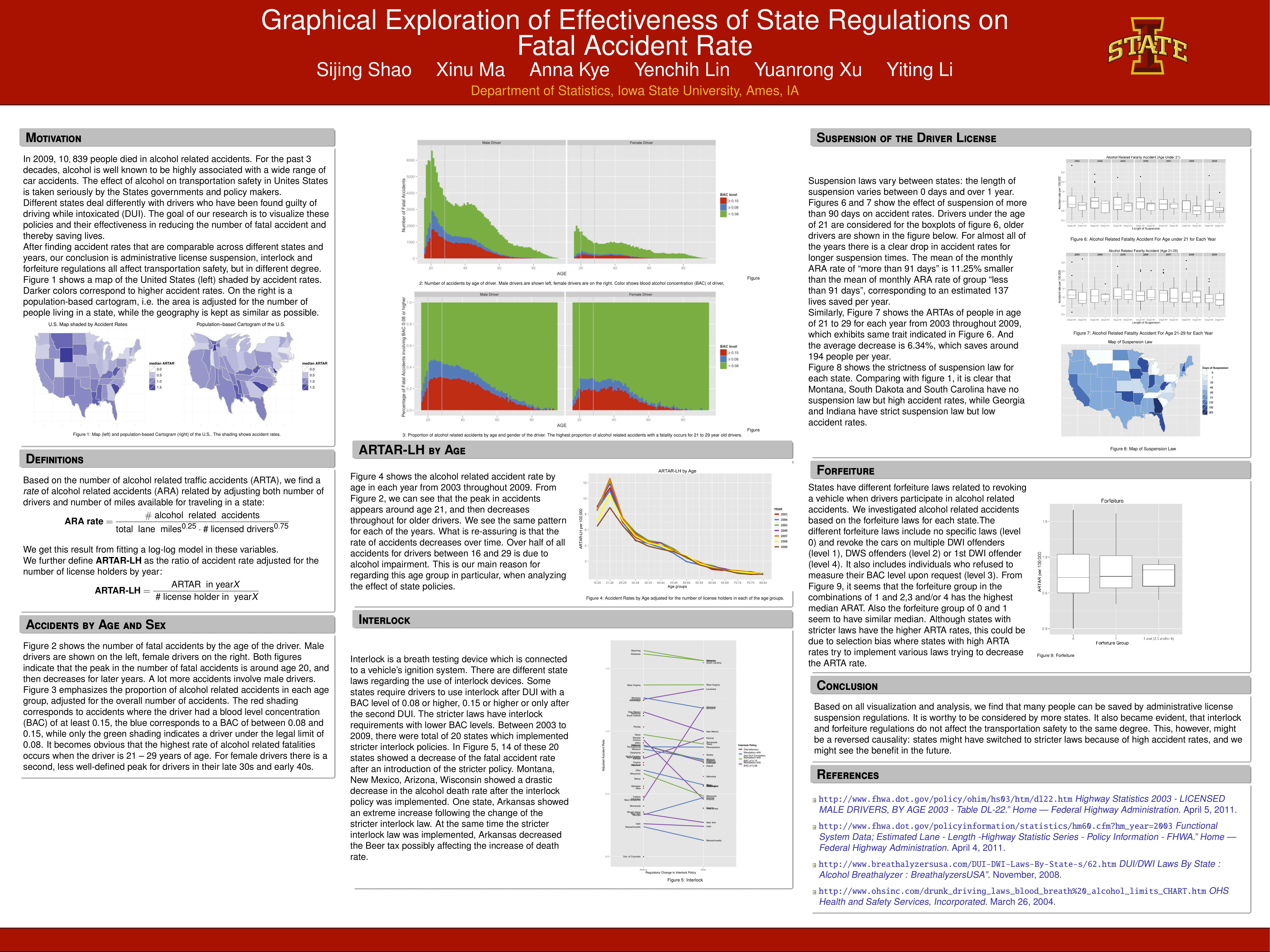 Drunk driving is a serious social problem, which takes thousands of lives per year. In the U.S. during 2009 alone, 10,839 people died in accidents where drinking was a contributing factor. Whole organizations (such as Mothers against drunk driving) are dedicated to reducing drunk driving accidents. We are interested in how dierent U.S. laws are related to the Alcohol Related Traffic Accident (ARTA). We categorized rates by state and then looked at dierences based on age and sex. Also we investigated dierent alcohol related laws to determine which laws relate to a decrease in the ARTA rate for particular age groups. We conclude with some suggestions for reducing the ARTA rate and hopefully saving many lives. Our graphical analysis suggests that younger drivers have higher ARTA rates. We therefore, focused on the two age groups under age 21 and between age 21 and 29. We focused our analysis on three main laws including suspension, interlock and forfeiture. Firstly, administrative license suspension is the law regarding the length of license is revoked after the first DUI. The suspensions laws vary for each state, therefore we investigated the dierence in death rate between states with a suspension of 91 day or less and greater than 91 days. We have created the map, which shows the strictness of suspension law for each state. Comparing states by suspension laws, it is clear that Montana, South Dakota and South Carolina have no suspension law with high accident rates, while Georgia and Indiana have strict suspension law with low accident rates. Secondly, interlock is a breath-testing device that is lined to a vehicles ignition system. There are different state laws regarding the use of interlock devices. Some states require drivers to use interlock after DUI with a BAC level of 0.08 or higher, 0.15 or higher or only after the second DUI. The stricter laws have interlock requirements with lower BAC levels. Between 2003 and 2009, a total of 20 states implemented stricter interlock policies. 14 of these 20 states showed a decrease on the death rate after the stricter policy. Montana, New Mexico, Arizona, Wisconsin showed a dramatic decrease in the alcohol related accident rate after the interlock policy was implemented. One state, Arkansas showed an extreme increase following the change of the stricter interlock law. At the same time the stricter interlock law was implemented, Arkansas decreased their tax on beer possibly acting the increase of accident rate. Lastly, states have different forfeiture laws related to revoking a vehicle when drivers participate in alcohol related accidents. We investigated alcohol related accidents based on the forfeiture laws for each state. The dierent forfeiture laws include no specic laws (and revoke the cars on multiple DWI oenders, DWS oenders or rst DWI oender. It also includes individuals who refused to measure their BAC level upon request. From the analysis, we gured out thatthe forfeiture group in the combinations of these forfeiture laws has the highest median ARAT. Although states with stricter laws have the higher ARTA rates, this could be due to selection bias where states with high ARTA rates try to implement various laws trying to decrease the ARTA rate. Therefore, based on these data, we suggest increasing the usage of interlock and having stricter laws on forfeit and suspenstions. By doing so, it is possible to prevent any tragic deaths and events caused by alcohol related accident.