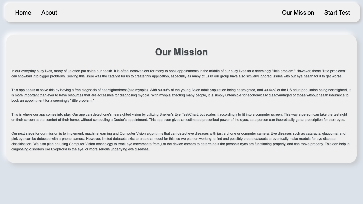 In our everyday busy lives, many of us often put aside our health. It is often inconvenient for many to book appointments in the middle of our busy lives for a seemingly "little problem." However, these "little problems" can snowball into bigger problems. Solving this issue was the catalyst for us to create this application, especially as many of us in our group have also similarly ignored issues with our eye health for it to get worse. This app seeks to solve this by having a free diagnosis of nearsightedness(aka myopia). With 80-90% of the young Asian adult population being nearsighted, and 30-40% of the US adult population being nearsighted, it is more important than ever to have resources that are accessible for diagnosing myopia. With myopia affecting many people, it is simply unfeasible for economically disadvantaged or those without health insurance to book an appointment for a seemingly "little problem."