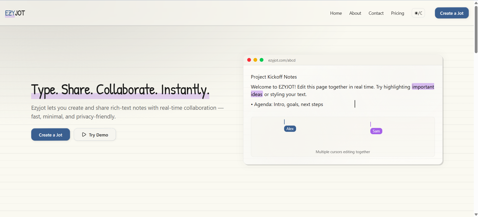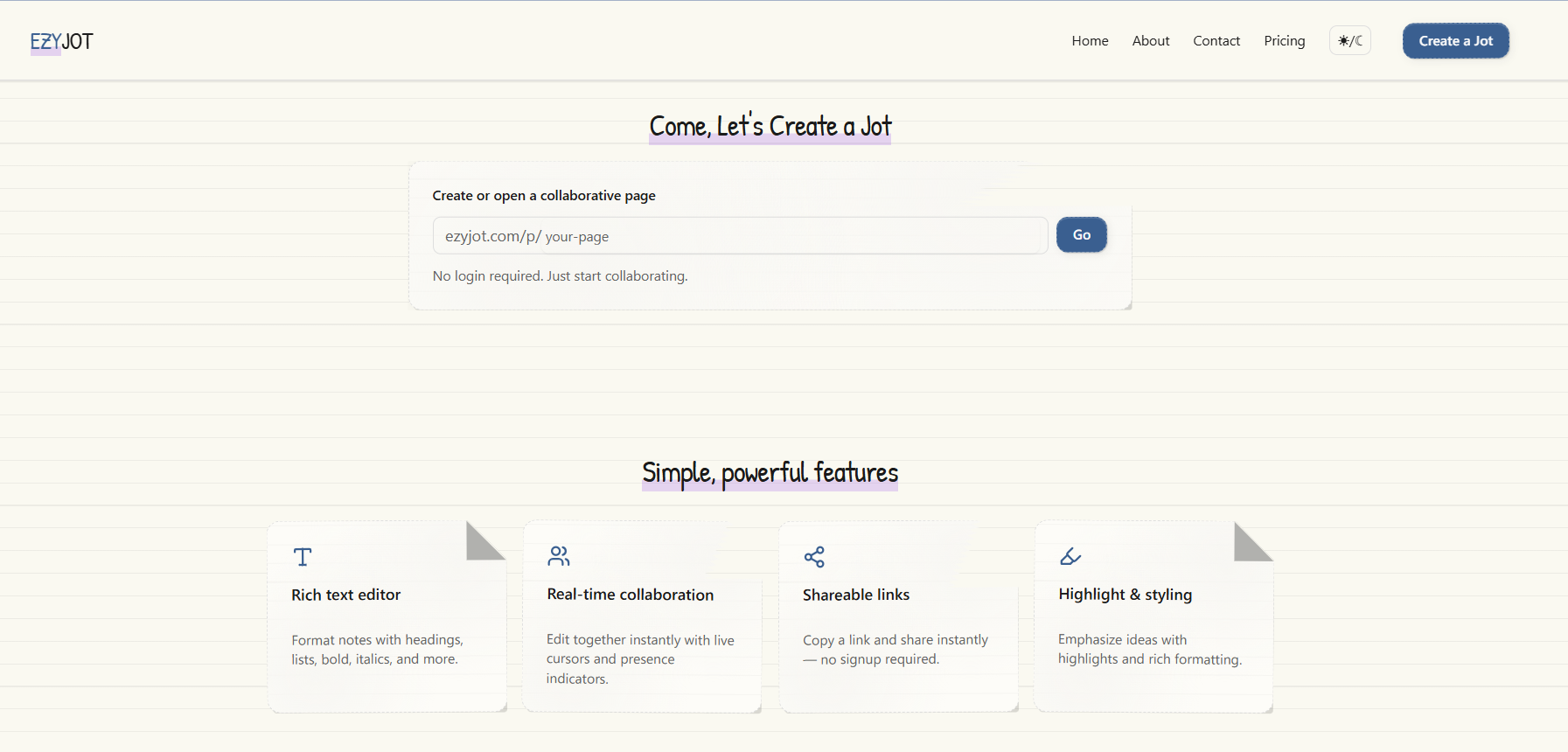 Have you ever been in a fast-paced workshop or a hackathon and realized that starting a "quick" collaborative note required a 2-minute sign-up flow, team invites, and complex permissions? We found that modern productivity tools like Google Docs and Notion are powerful but "heavy"—they create a friction point that kills the creative spark. We wanted to build something "ephemeral yet permanent": a collaborative space that spawns instantly, exactly when you need it, with zero barriers to entry. Ezyjot was born from the desire to make digital collaboration as fast as a handwritten note.