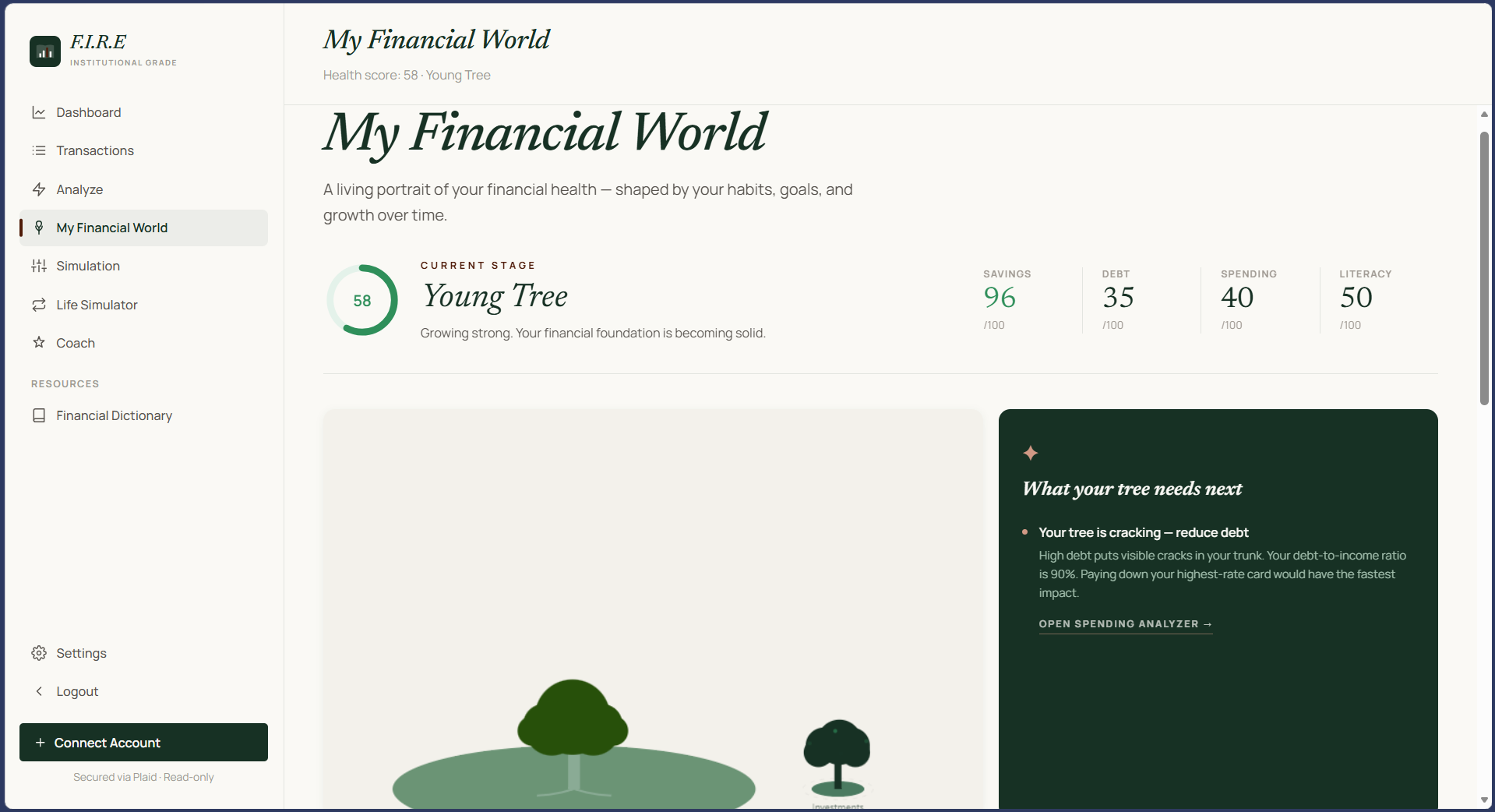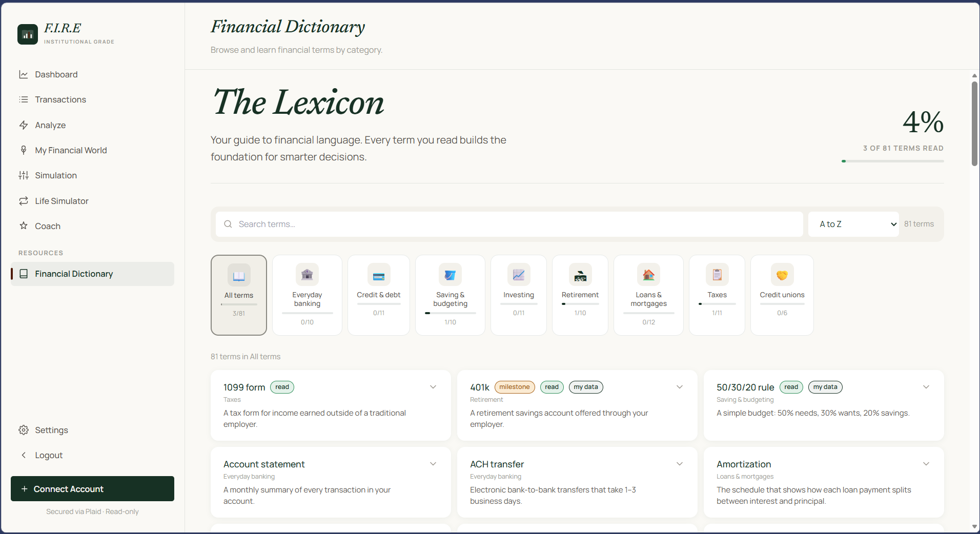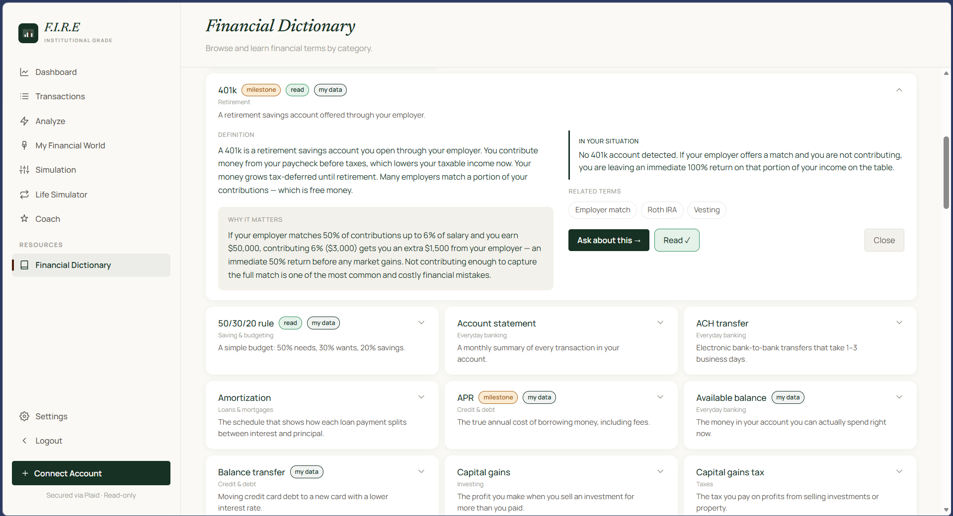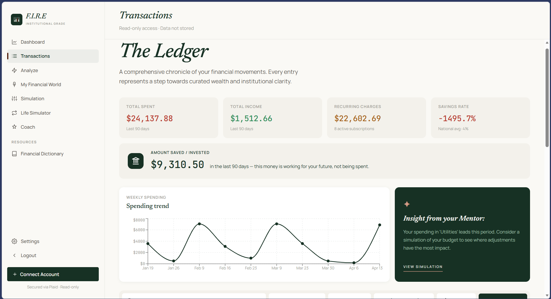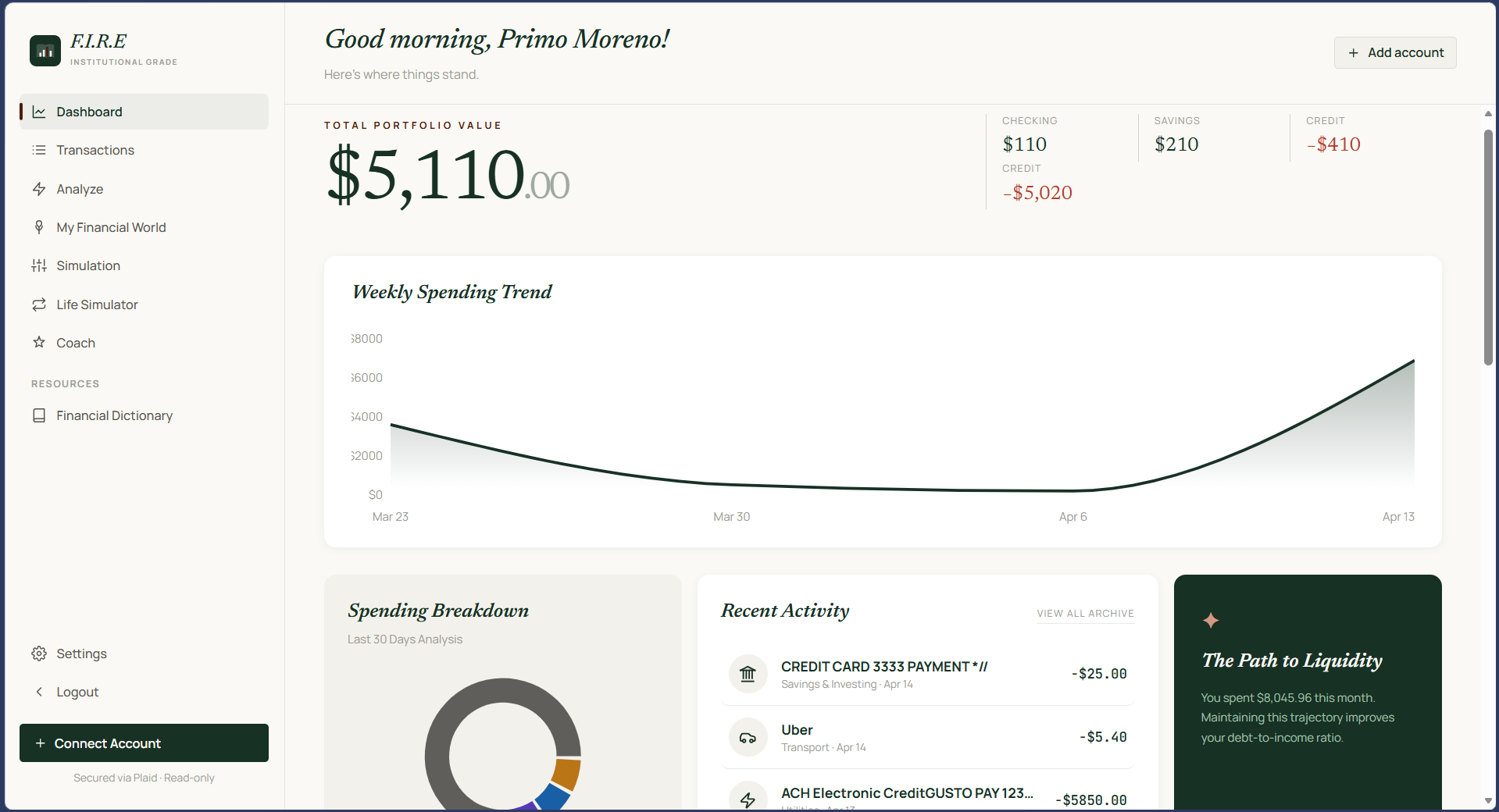 F.I.R.E. (Financial Independence Retire Early) connects to your real bank accounts via Plaid and aggregates all your financial data in one place. It: