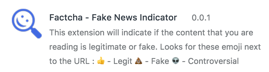This extension will indicate if the content that you are reading is legitimate or fake. Look for these emoji next to the URL: (thumb up) - Legit (Poo) - Fake (Alien) - Controversial