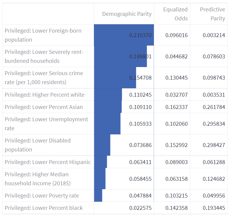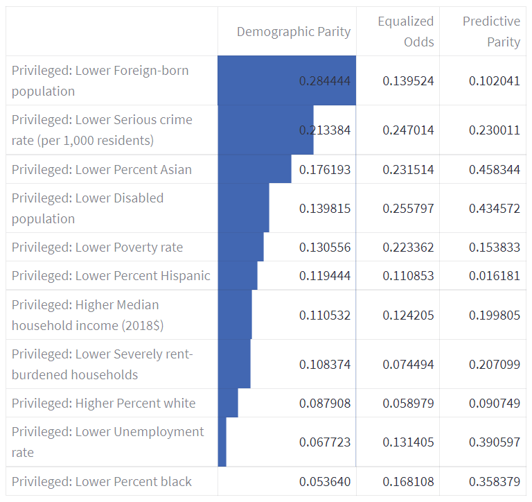 Based on this analysis, we then identified a number of features that could be potentially sensitive. For example, we noticed that some neighbourhoods had as much as 74.1% of the population made up of Hispanic citizens, while others had as little as 3.7%. This large disparity in values could be a point of concern.