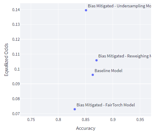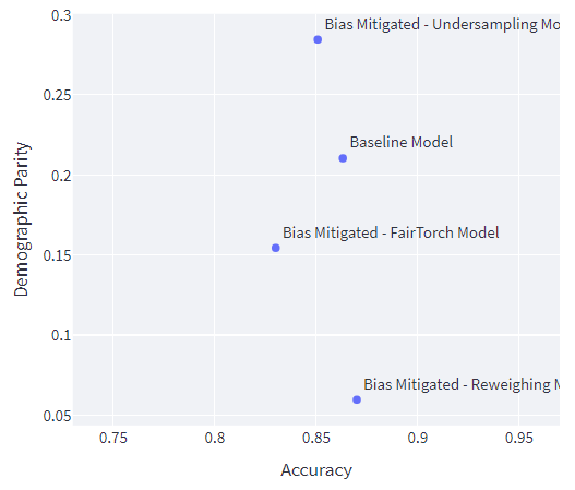 Although here we can observe that the undersampling bias mitigation technique has resulted in a higher DP than the baseline model. Comparing the DP for both models, the model with under sampled data has higher DP compared to the baseline (0.284 vs 0.210). Both accuracy and disparity decreased.