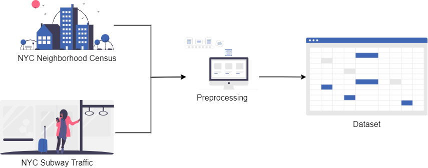 The dataset we selected consists of subway traffic in NYC, along with neighbourhood census data of the city. It is hosted on Kaggle by Edden, who has performed preprocessing steps to convert the raw data provided by The Metropolitan Transportation Authority (MTA), North America's largest transportation network. The census data is from NYU Furman Center's New York City neighbourhood Data Profiles and the neighbourhood data is from University of Berkeley GeoData Library.