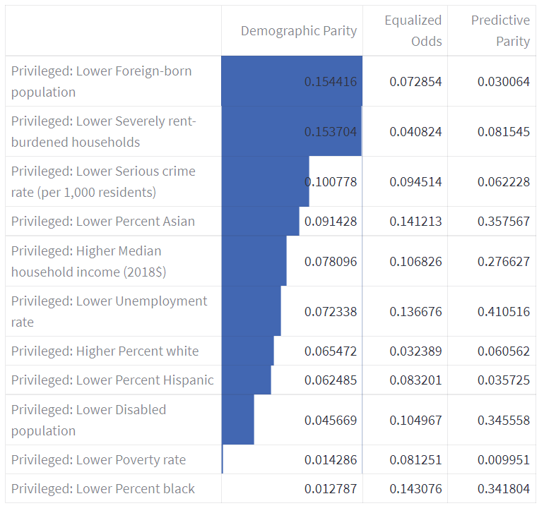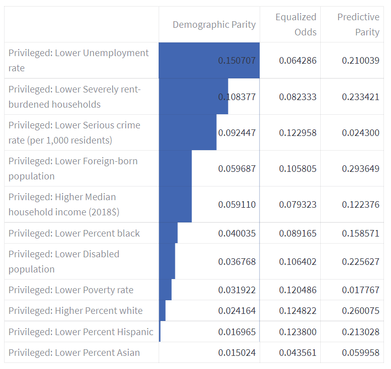 Based on our assessment of both data fairness and model fairness, we narrowed down to a list of features that exhibited both high Jensen-Shannon Divergence and high Demographic Parity disparity. On the top of that list was the Privileged: Lower Foreign-born population feature, with a score of 0.0264 max Jensen-Shannon Divergence and 0.2251 Demographic Parity.