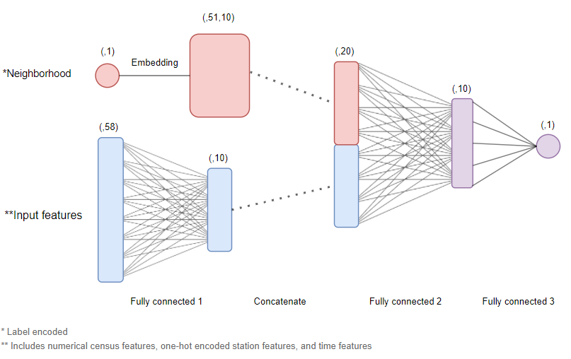 The dataset we are working with is a 2-dimensional dataset, consisting of both spatial and temporal dimensions; also frequently known as "panel” data. Other approaches to similar problems often include more complex architectures involving LSTMs, CNNs or transformers. However, in this use case, we opted to keep things simple by using a standard multi-input feedforward network.
