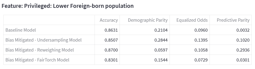 With Privileged: Lower Foreign-born population as the sensitive feature, undersampling was applied to the dataset (pre-processing mitigation) and demographic parity loss (in-processing mitigation) was utilised during model training. The mitigation approaches are applied separately, thus the resulting datasets and models are independent of each other.