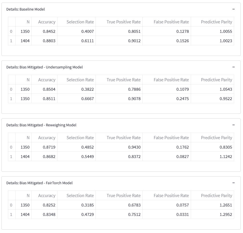 All 4 of our trained models (1 baseline, 3 post-mitigation) were then again uploaded onto the FairWell Model Bias Detection & Mitigation page, for a side-of-side comparison of the models' metrics.