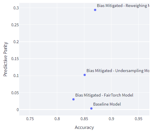 Back to the model, the baseline trained model, testing dataset and feature list were then uploaded onto the FairWell Model Bias Detection & Mitigation page. Inference is then run automatically within the FairWell environment to generate the following fairness metrics for our baseline model predictions: Demographic Parity, Equalized Odds and Predictive Parity. Here, the metric we focused on is Demographic Parity, making sure each subgroup receives a positive outcome at an equal rate.