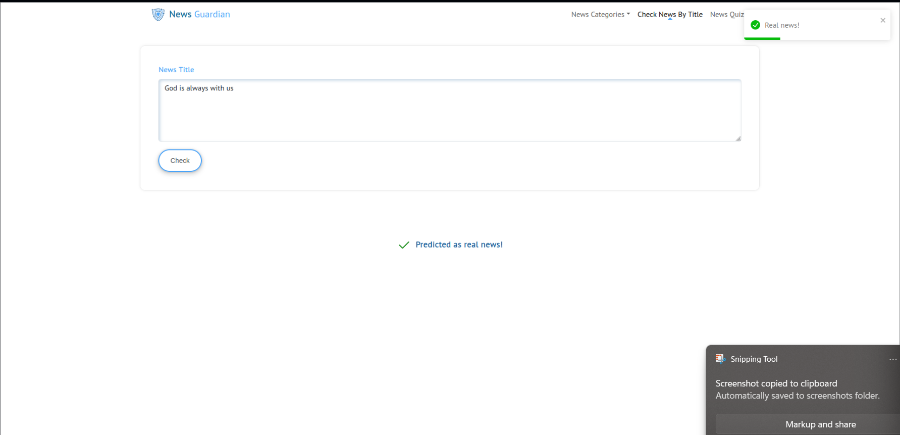 Live News Monitoring: View real-time predictions for news articles. News Quiz: Test your fake news detection skills by taking our news quiz. Check News by Title: Enter a news title to see if it's predicted as real or fake.