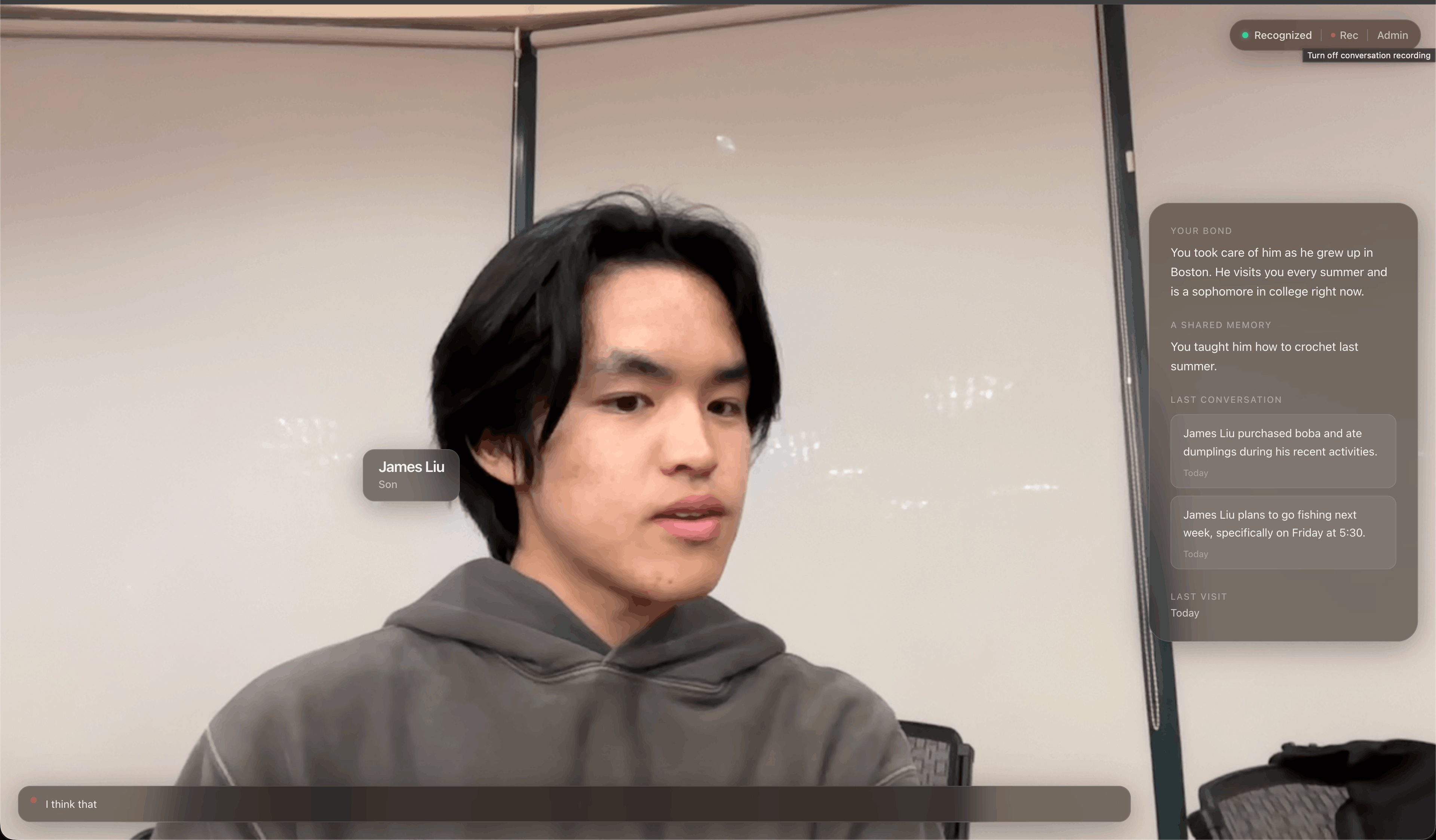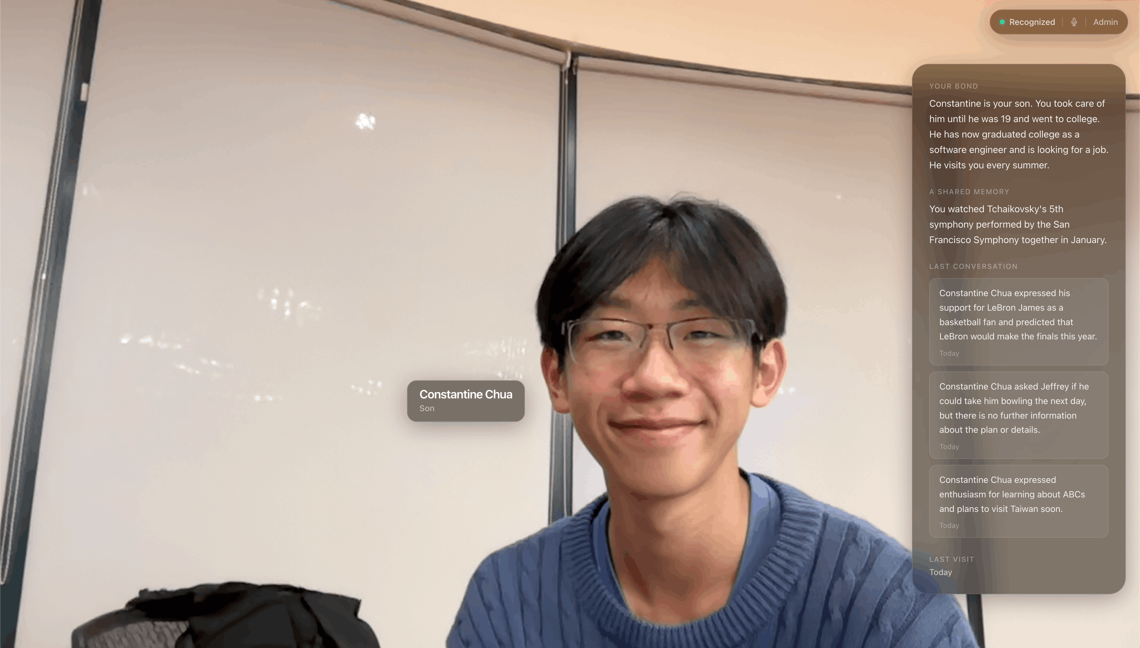 An app for dementia patients that runs on a tablet/monitor in their room. When a visitor walks into the camera frame, it recognizes their face and instantly displays reassuring context about who they are allowing patients to recall an individual from past memories. It also records and summarizes conversations for future reference.