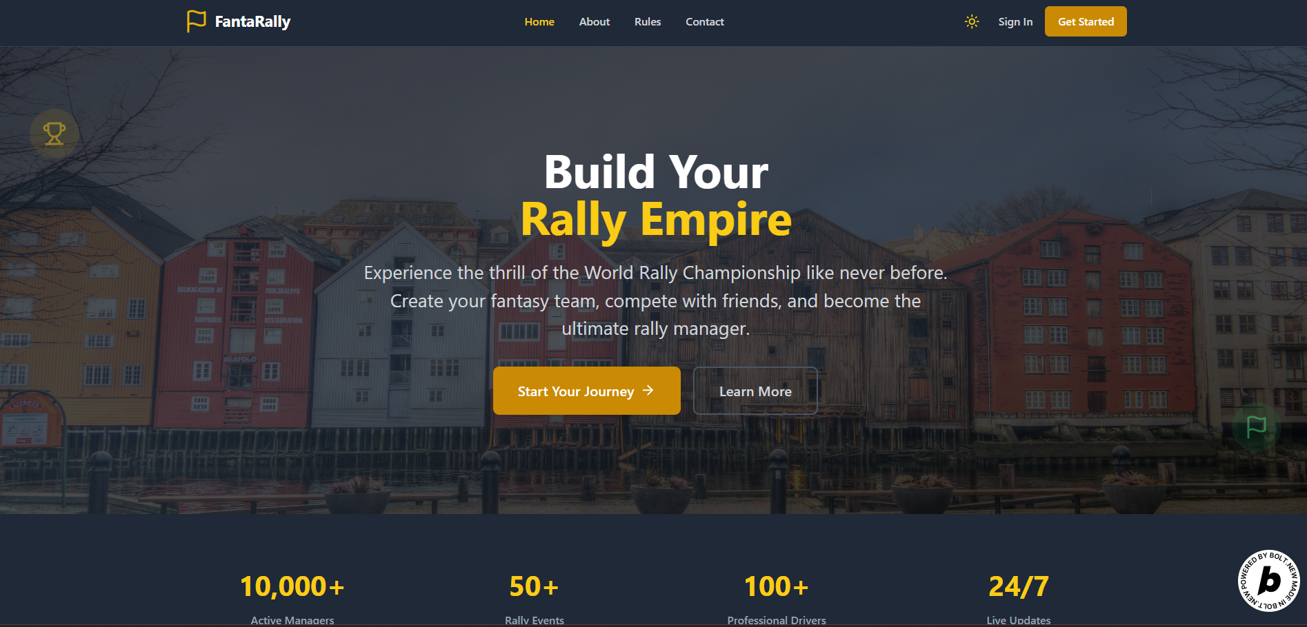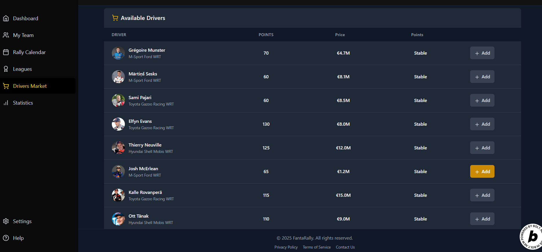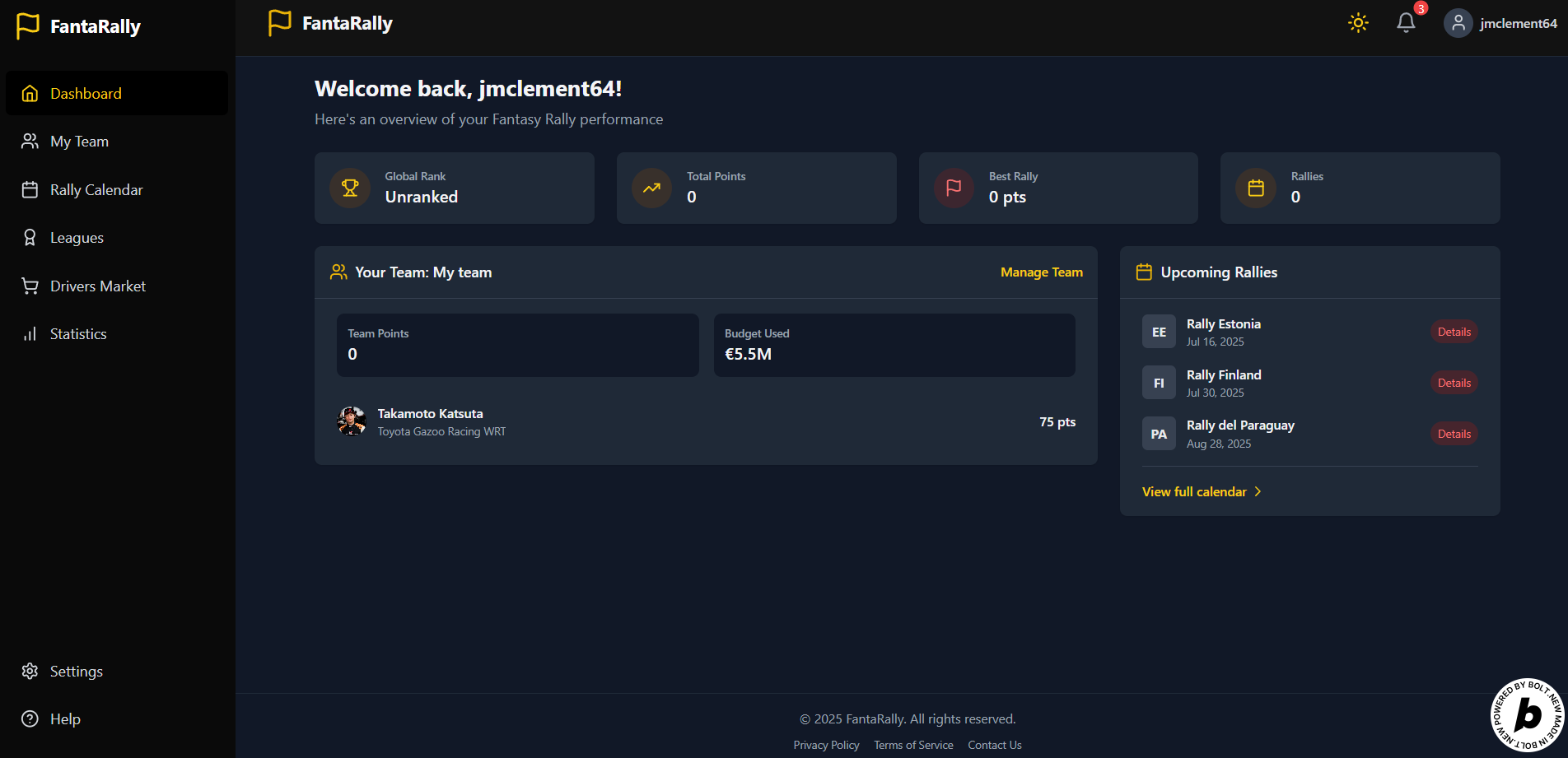 The platform was built using bolt.new and modern web technologies. The backend handles live data parsing and score calculation from rally results. The frontend is a user-friendly interface where users can register, create teams, join leagues, and view standings. The site is hosted at: https://fantarally.site We have split it with dedicated admin area, for race, drivers, results and general settings. Both webapp was built using bolt.new (admin area has be tweaked a little more on local using windsurf), project was too big for deal it on bolt.new