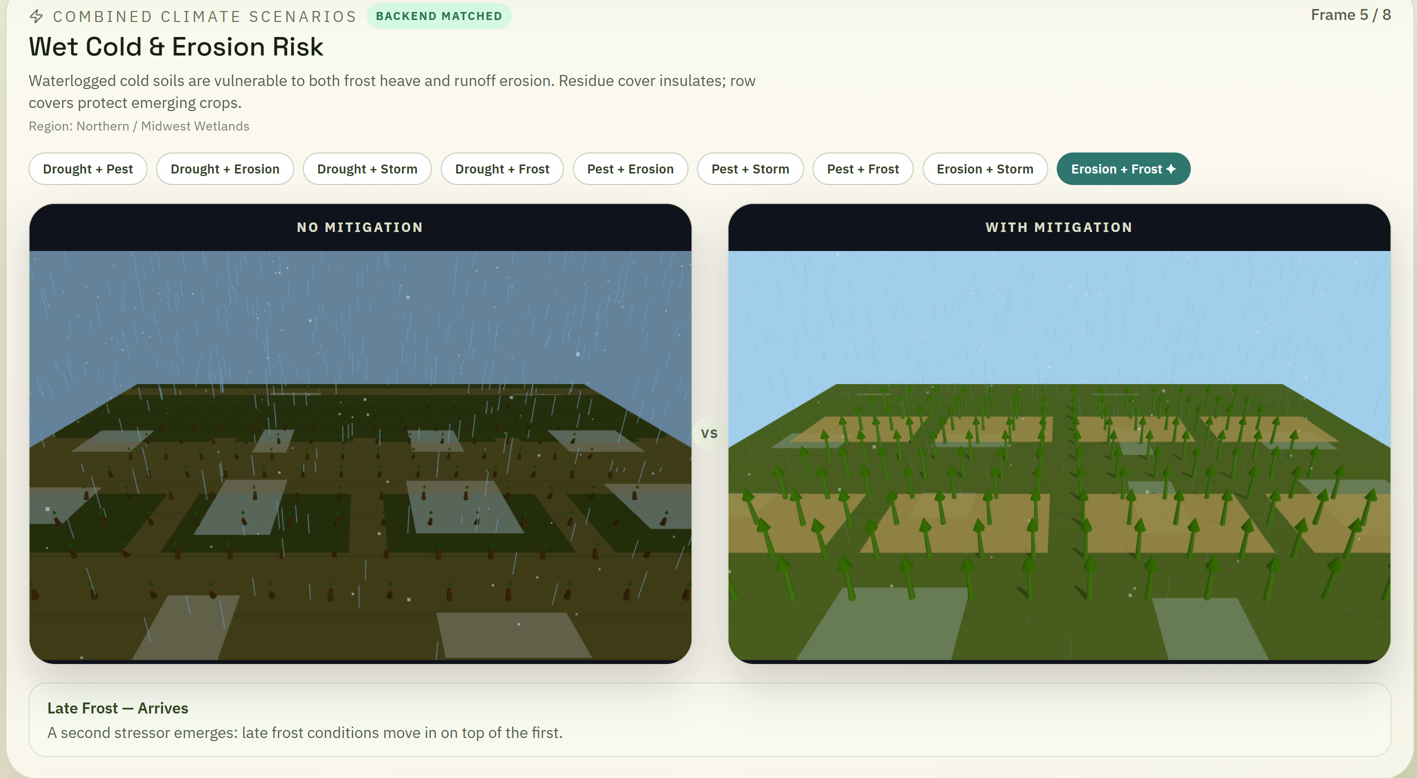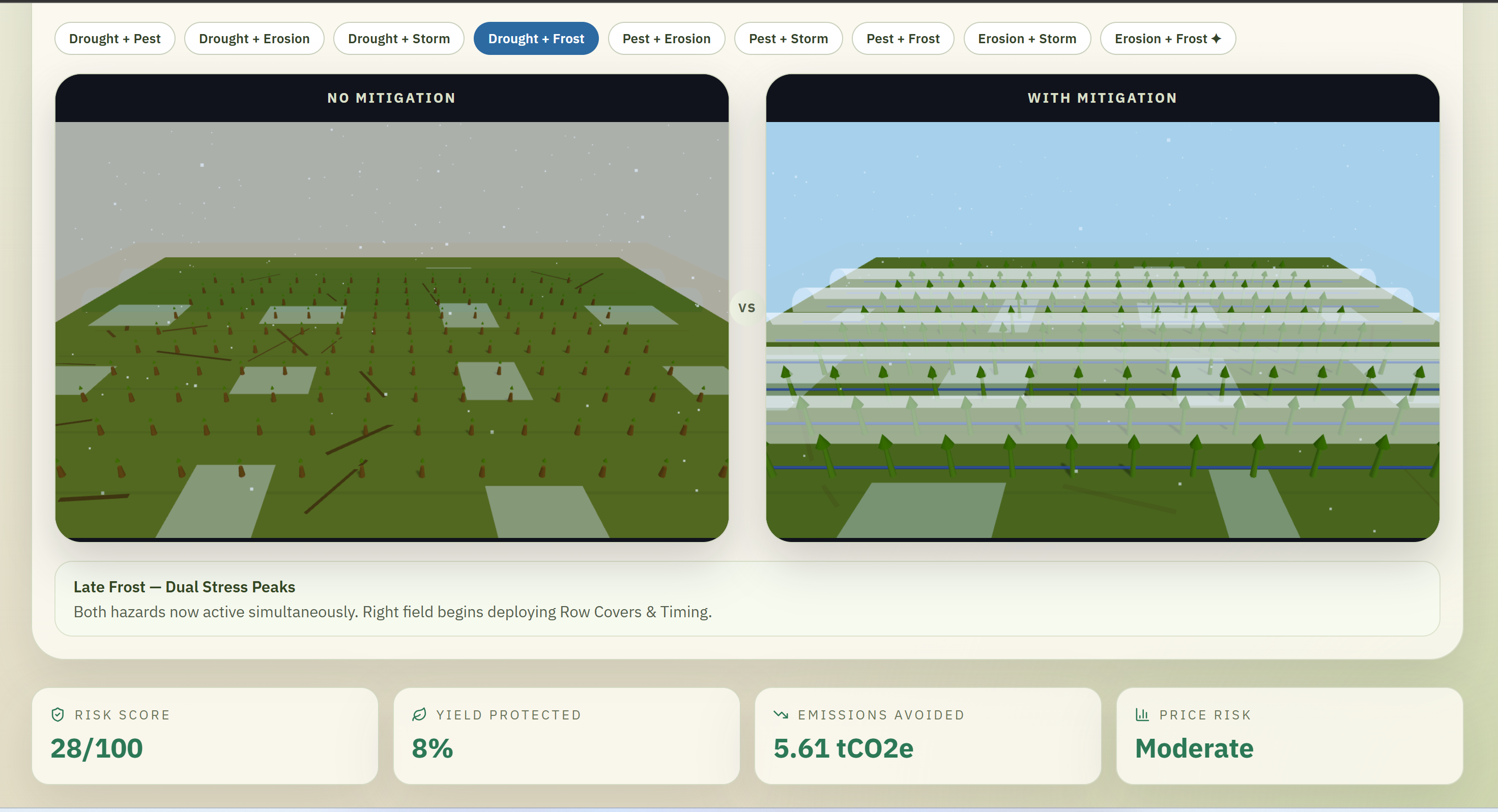 - Visual Proof: Farmers see a "Traditional Chaos" animation (predicted crop damage/stress) vs. a "FarmSim Advantage" animation (showing the impact of suggested mitigation).