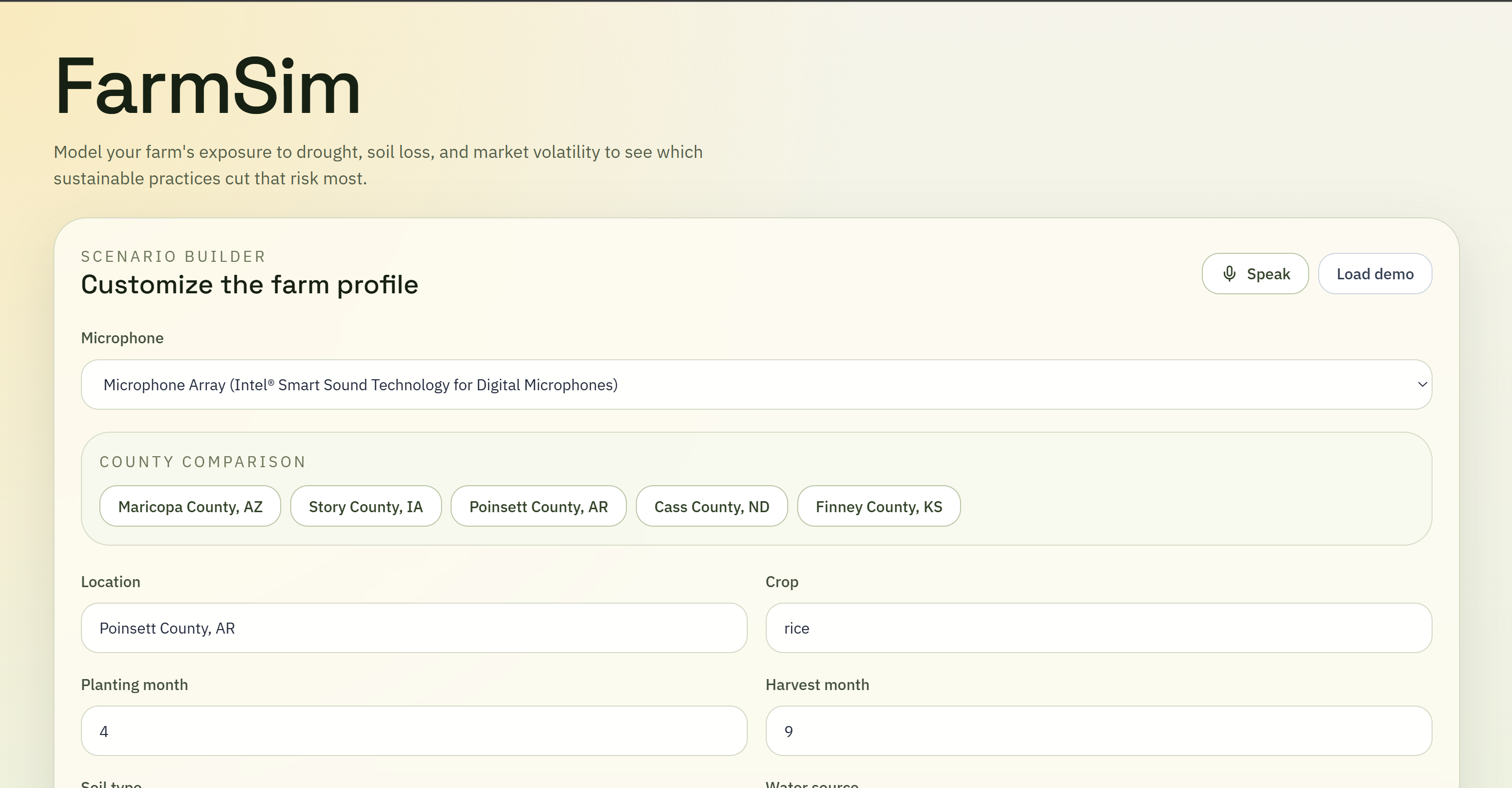 Farmers face complex, high-stakes decisions with shrinking margins for error. Climate volatility, labor shortages, and rising input costs mean a single wrong call can end a season. We built FarmSim to move beyond inaccessible jargon. We wanted to take a farmer’s specific profile and answer: "What does my field look like in three months if I don't change my irrigation, vs. if I do?" Driven by a love for open source, we combined real-world data with custom 3D visualization to make risk tangible.