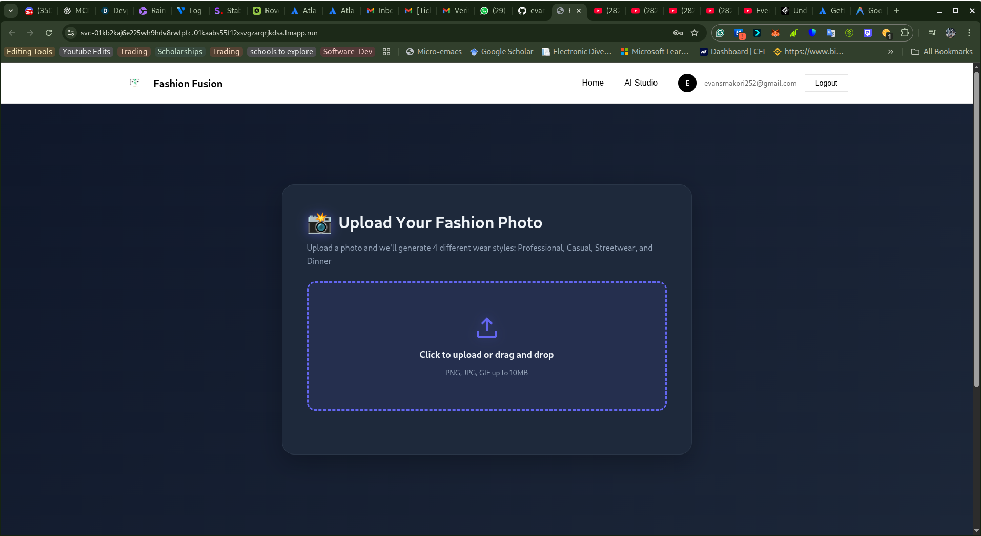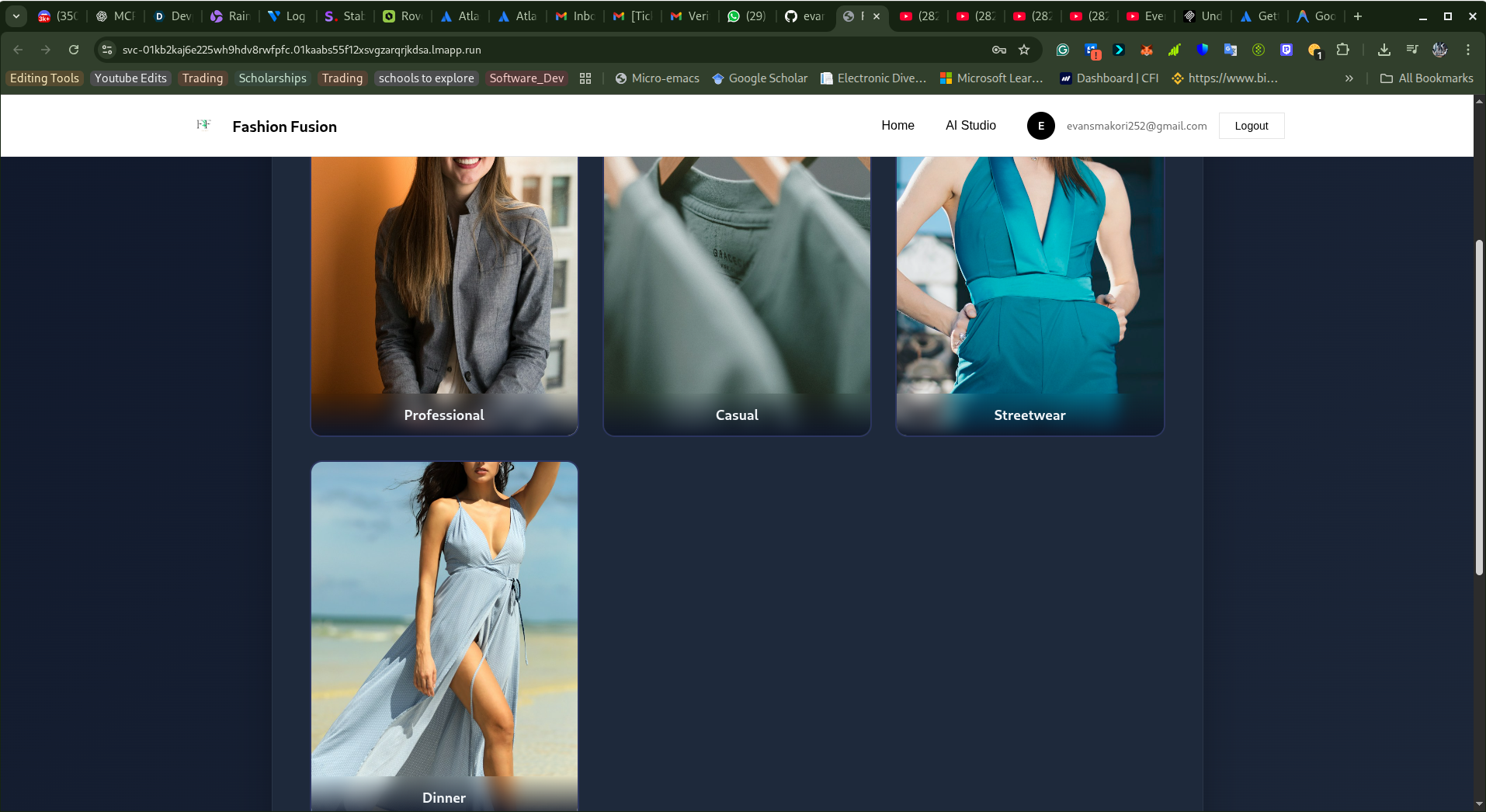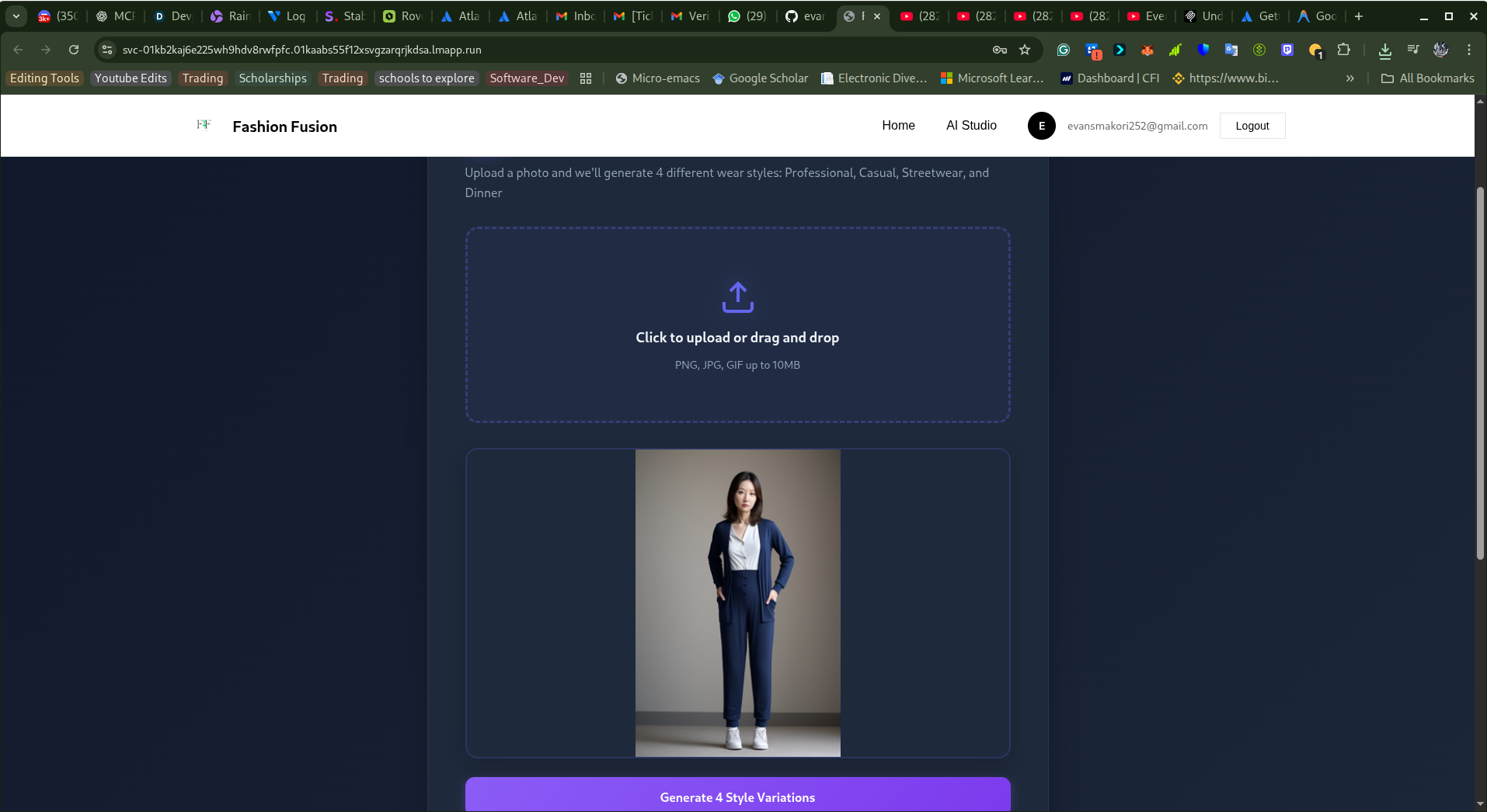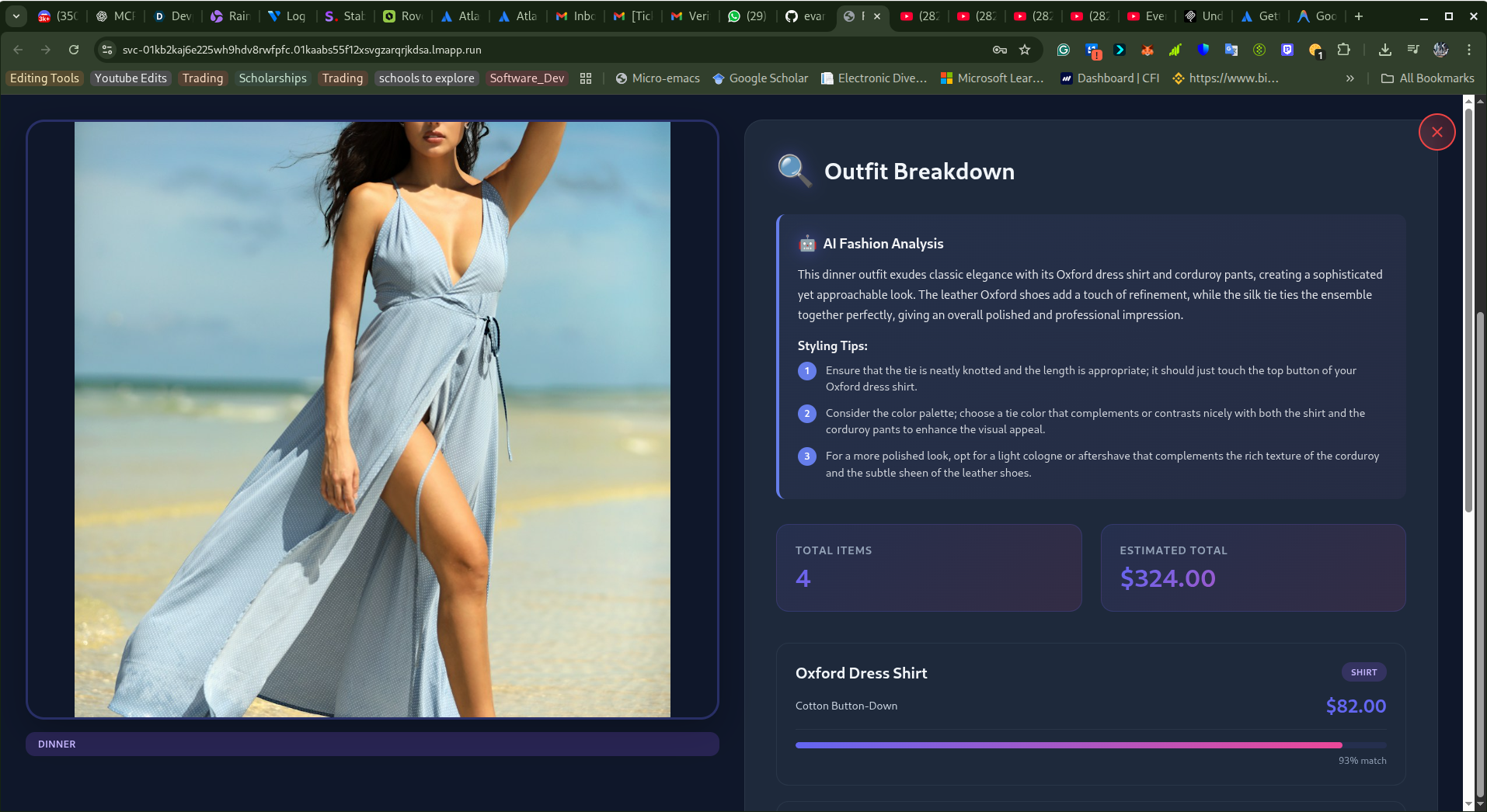 The app transforms a single photo into multiple polished style variations (Professional, Casual, Streetwear, Dinner), analyzes detected items, estimates pricing, and returns shopping suggestions and styling notes through a responsive web UI.