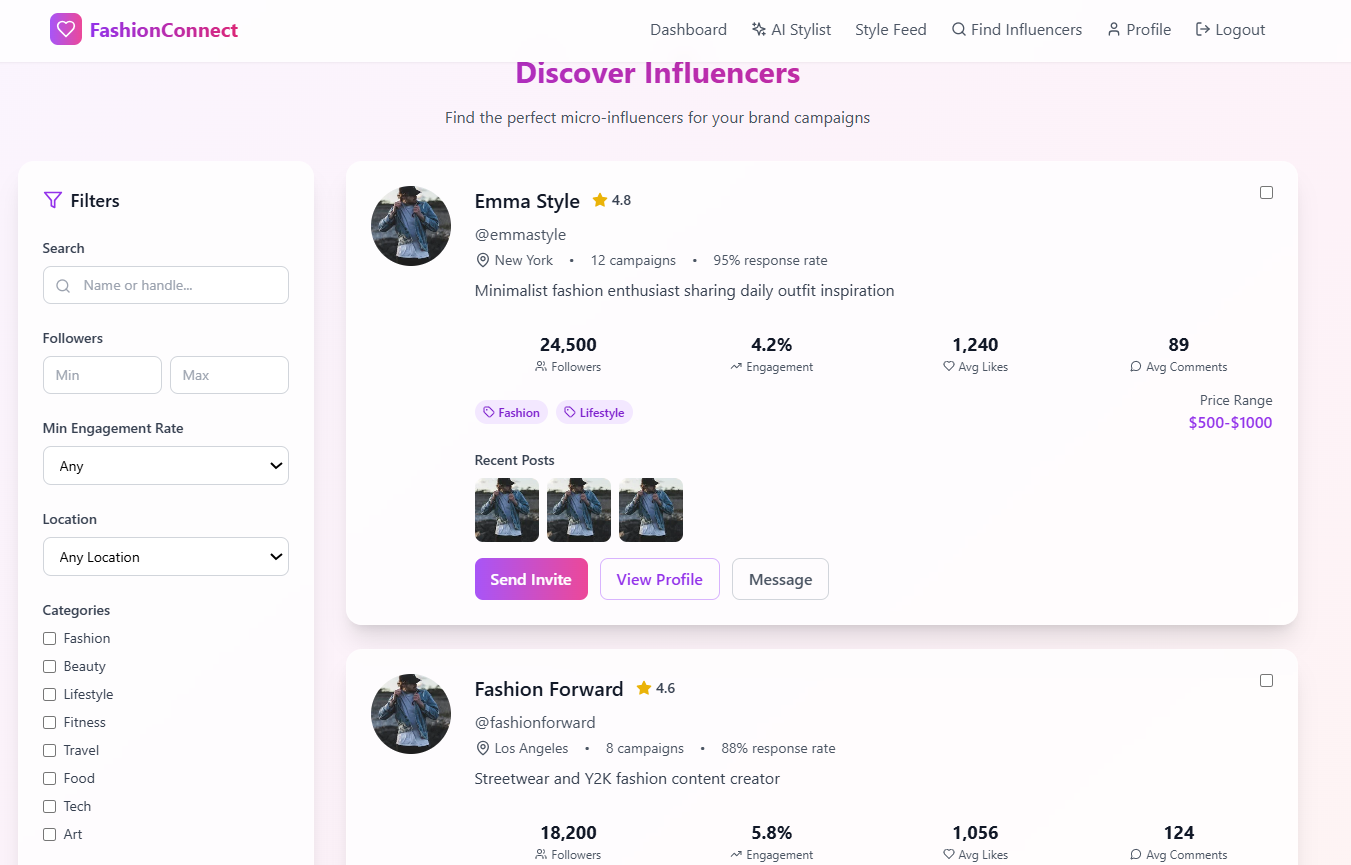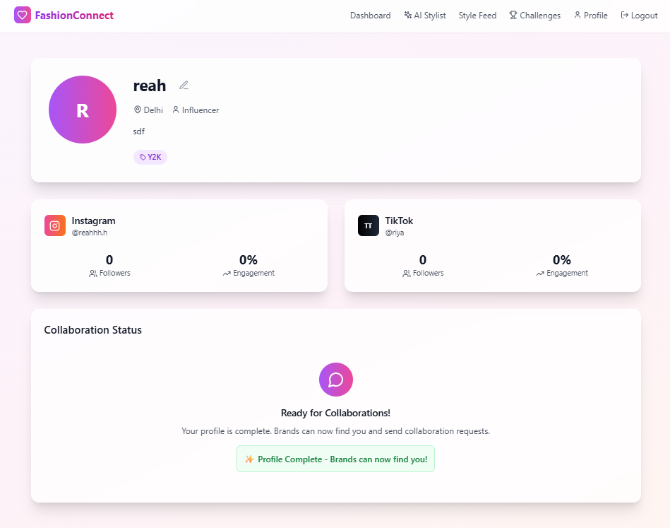 FashionConnect is a platform that empowers micro-influencers to connect with fashion brands, showcase their style, and grow their influence — all while engaging with a vibrant fashion-forward community.