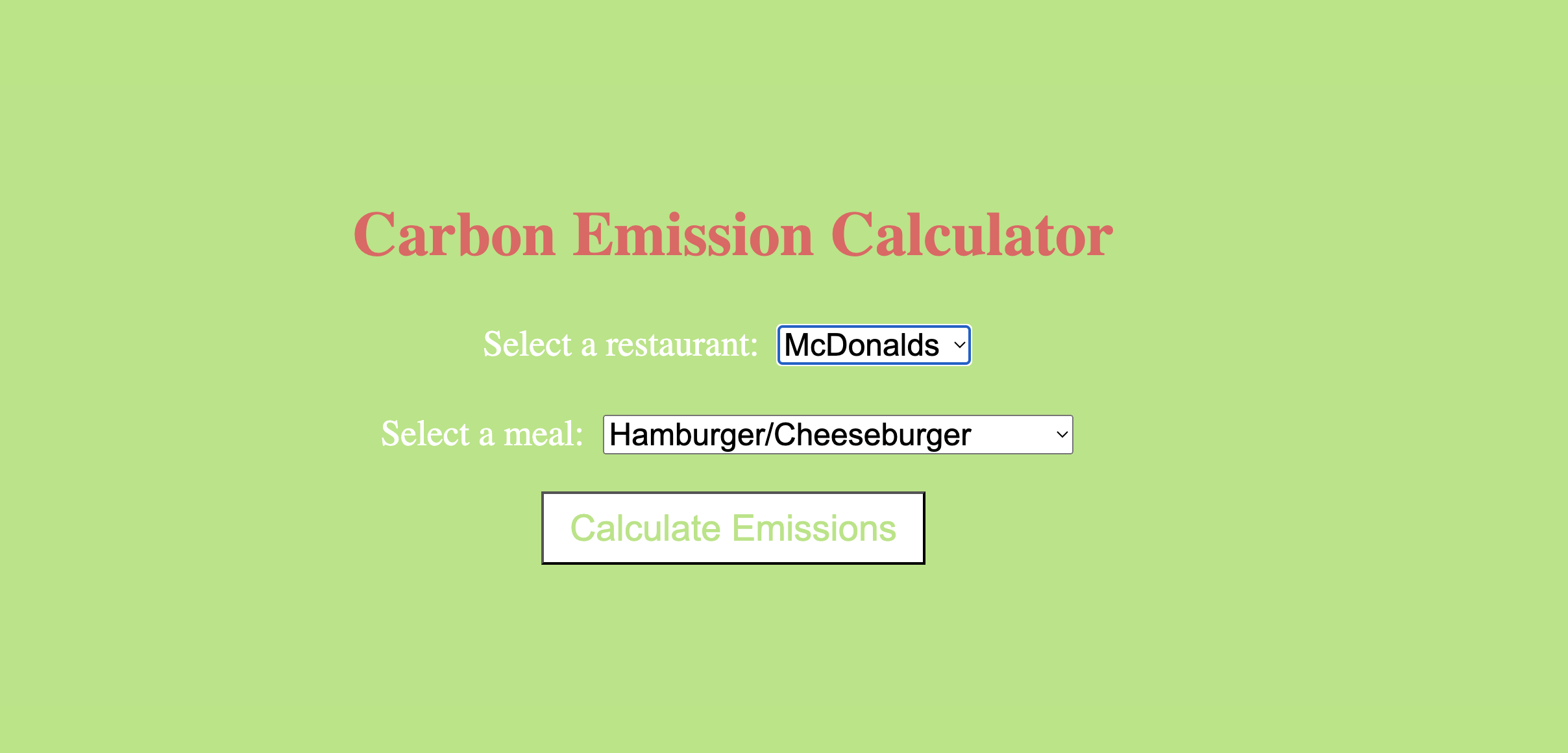 We first compiled a list of common meat and dairy items from large food chains, extracted the files, and calculated how much carbon emissions each meal would produce. We then produced an interface so users could select which restaurant and meal they ate. We struggled a lot when producing an interface so that users could interact with our calculator, but we eventually settled on using FLASK. All in all, we are very happy with how the interface and the code turned out. Through this project, we were able to become familiar with Tkinter and also learned about debugging in general. As for what's next, we hope to expand our project by making the interface look cleaner, having more items from different stores, and improving the project as a whole. Through our project, we hope individuals are more mindful of how they contribute to carbon emissions, leading to a healthier planet overall.