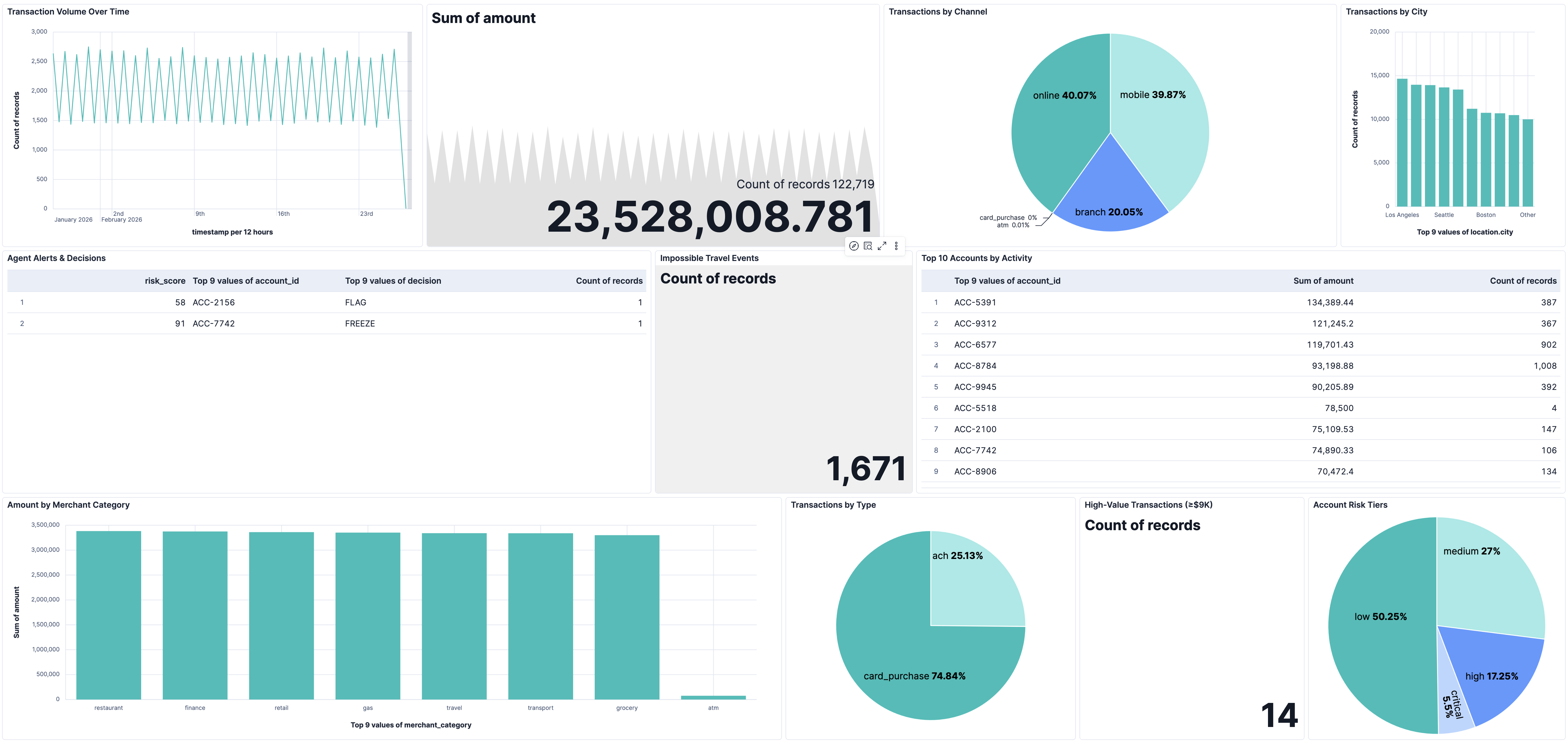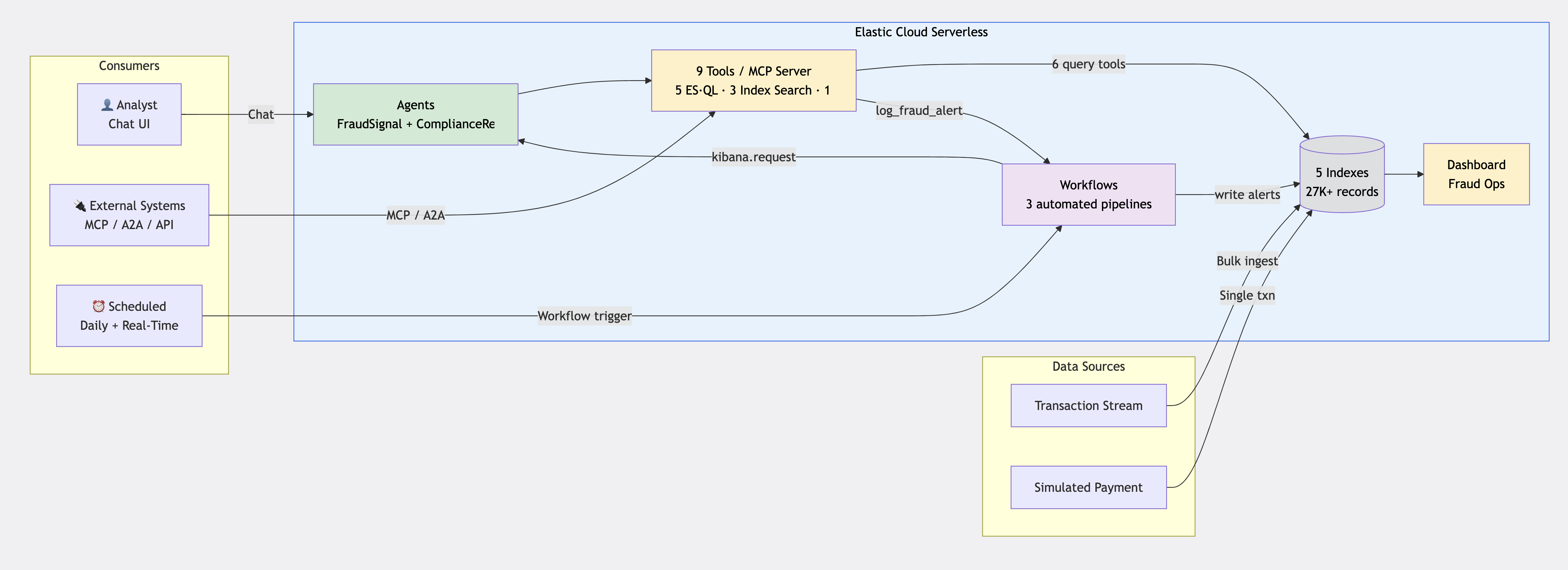 Powered entirely by Elastic Agent Builder on Elastic Cloud Serverless, FraudSignal orchestrates two specialized agents through three automated workflows (manual, daily, and real-time 1-minute monitoring). Nine custom tools (5 ES|QL, 3 Index Search, 1 Workflow) drive the reasoning. All capabilities are exposed via MCP and A2A servers. The system runs on ~126,000 synthetic transactions across 400 accounts, with pre-computed geospatial fields for speed and reliability.