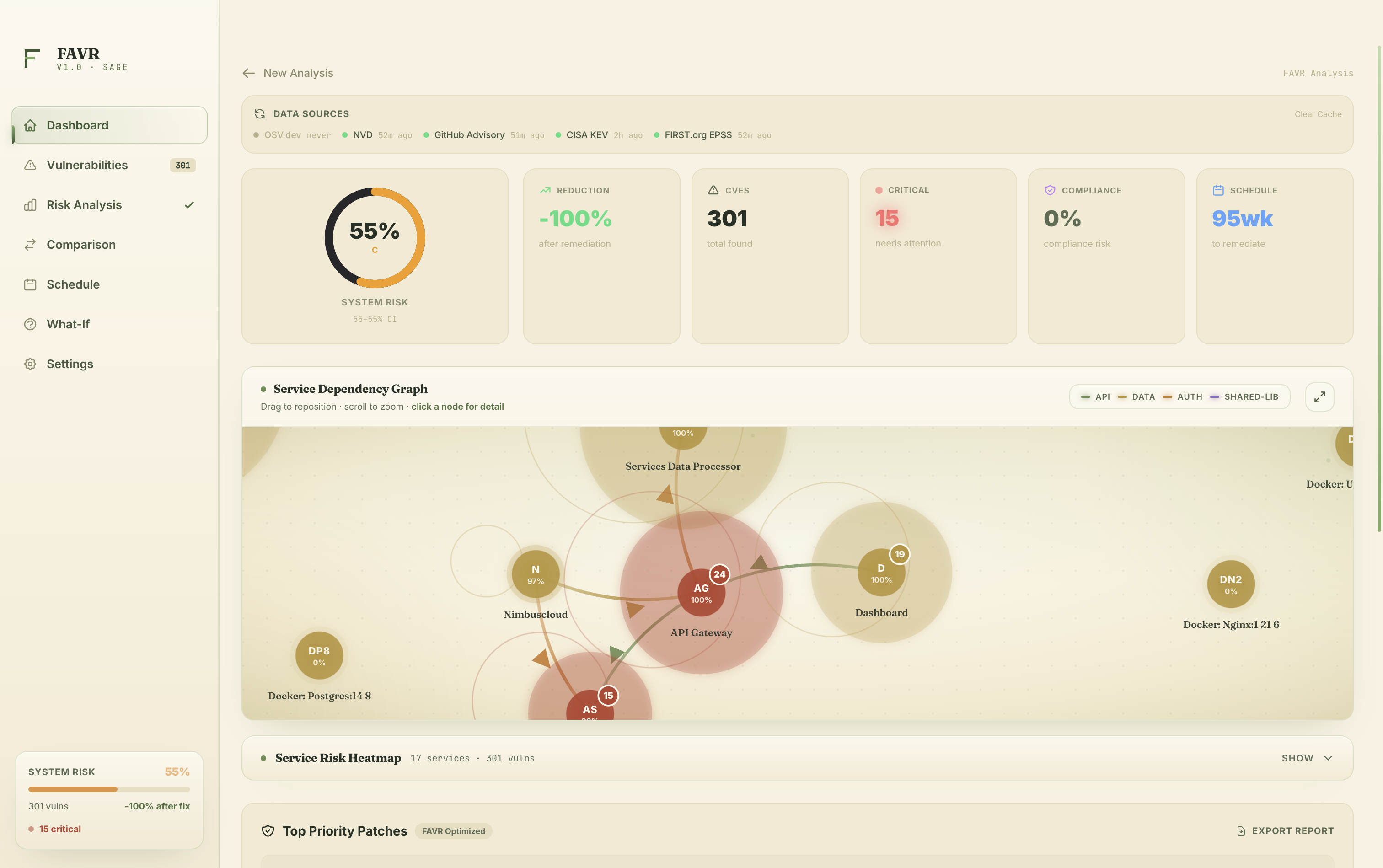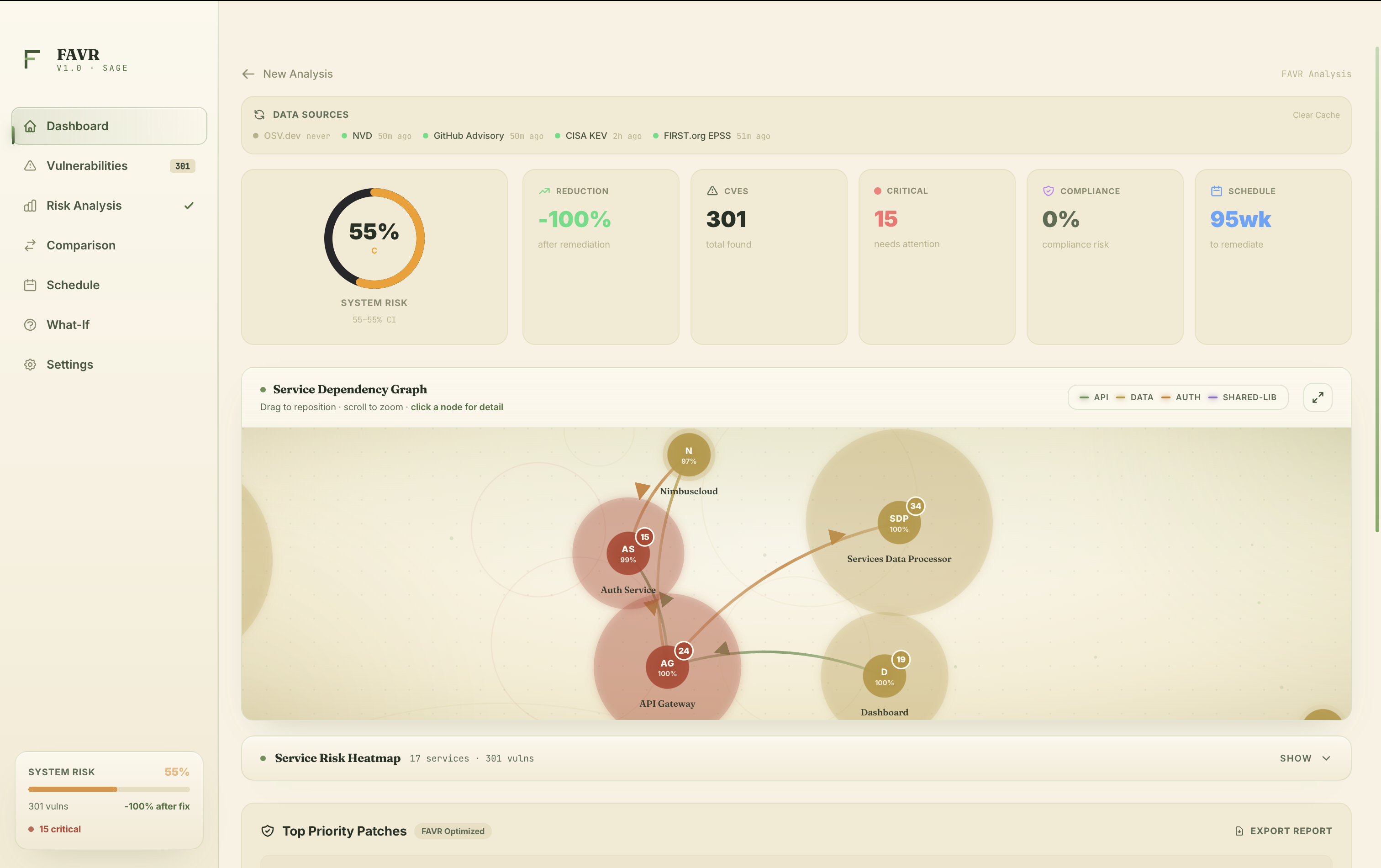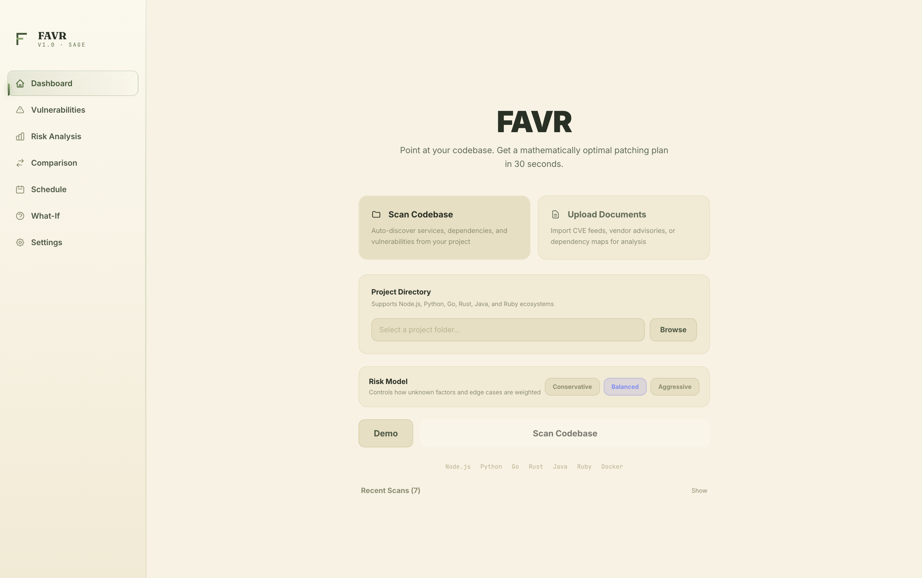 FAVR (Flexible Attack Vector Risk) is a desktop application designed to provide a "mathematically optimal patching plan in 30 seconds". It allows a user to point the tool at a local directory, where it auto-discovers services and maps dependencies across multiple languages like Node.js, Python, and Go.