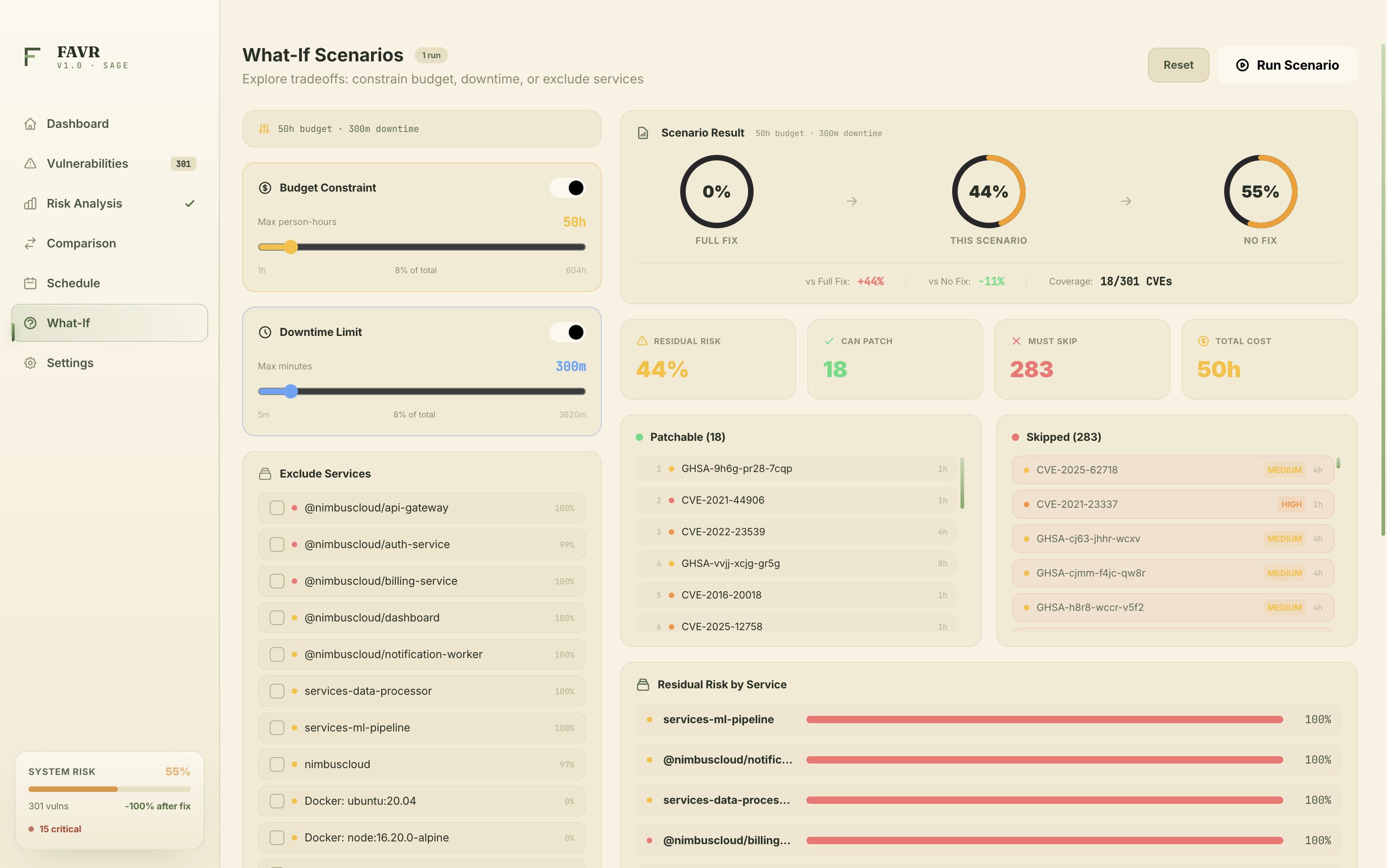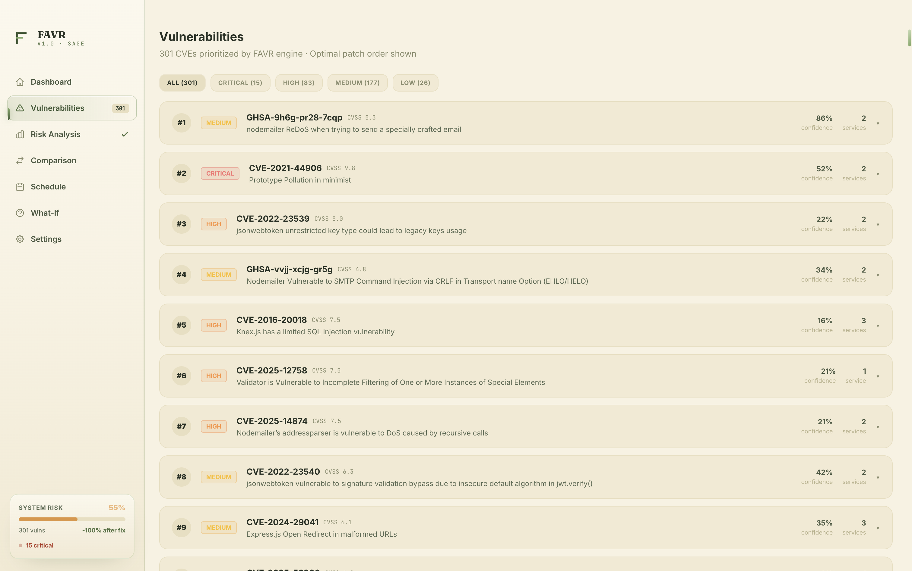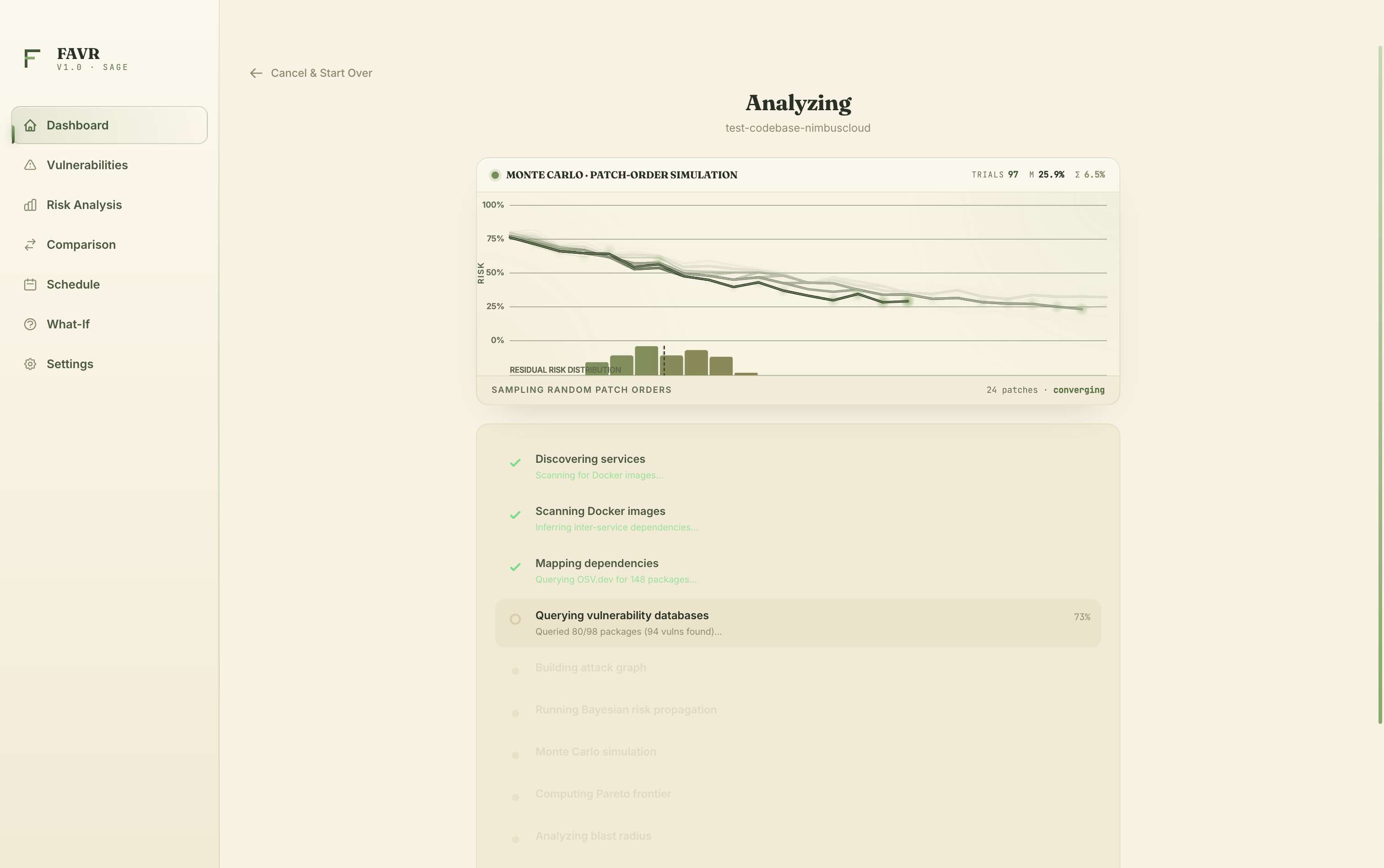 FAVR (Flexible Attack Vector Risk) is a desktop application designed to provide a "mathematically optimal patching plan in 30 seconds". It allows a user to point the tool at a local directory, where it auto-discovers services and maps dependencies across multiple languages like Node.js, Python, and Go.