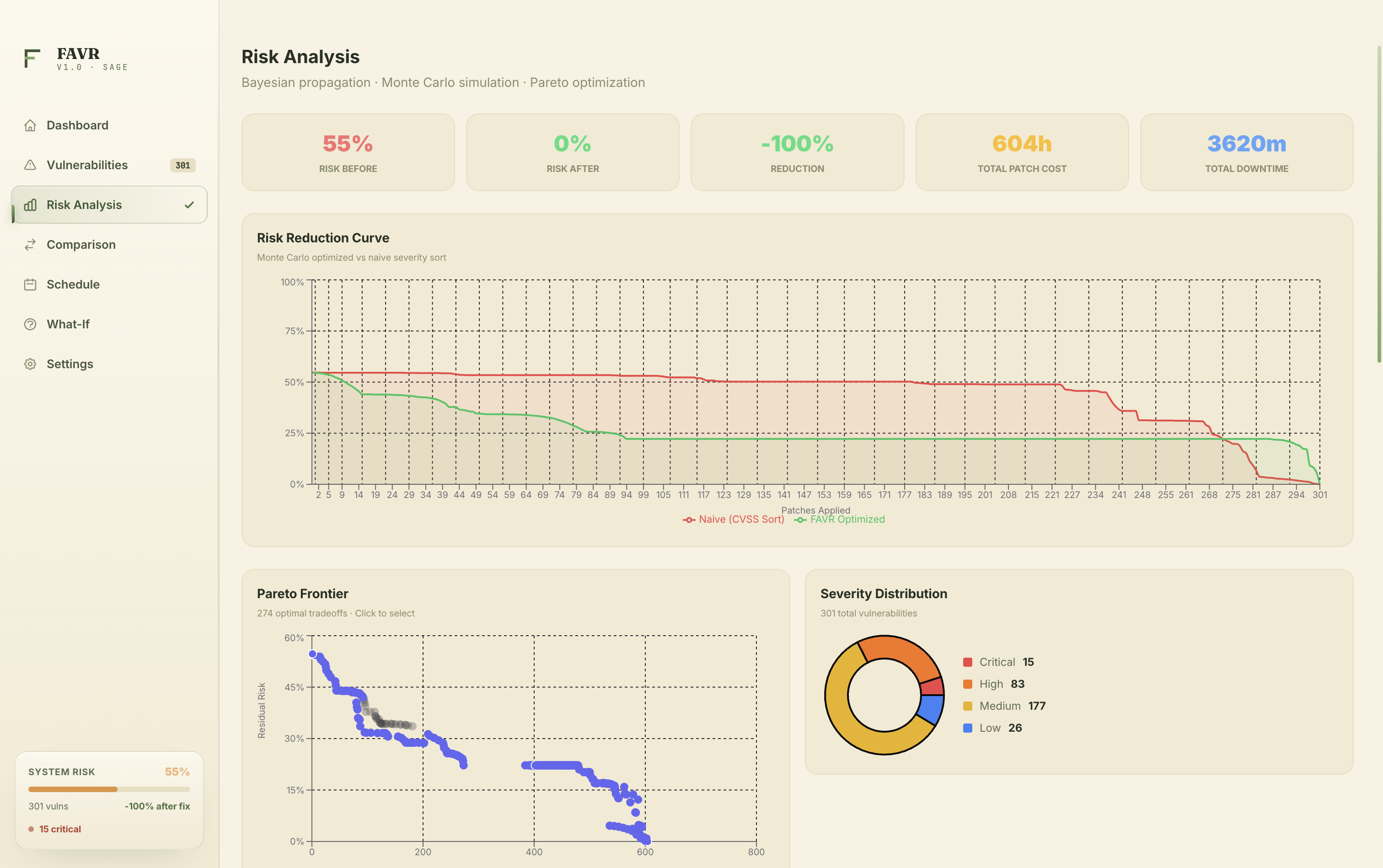 - Simulation & Optimization: Runs Monte Carlo simulations and Pareto optimization to tell you exactly which five patches will reduce your system's risk the fastest.