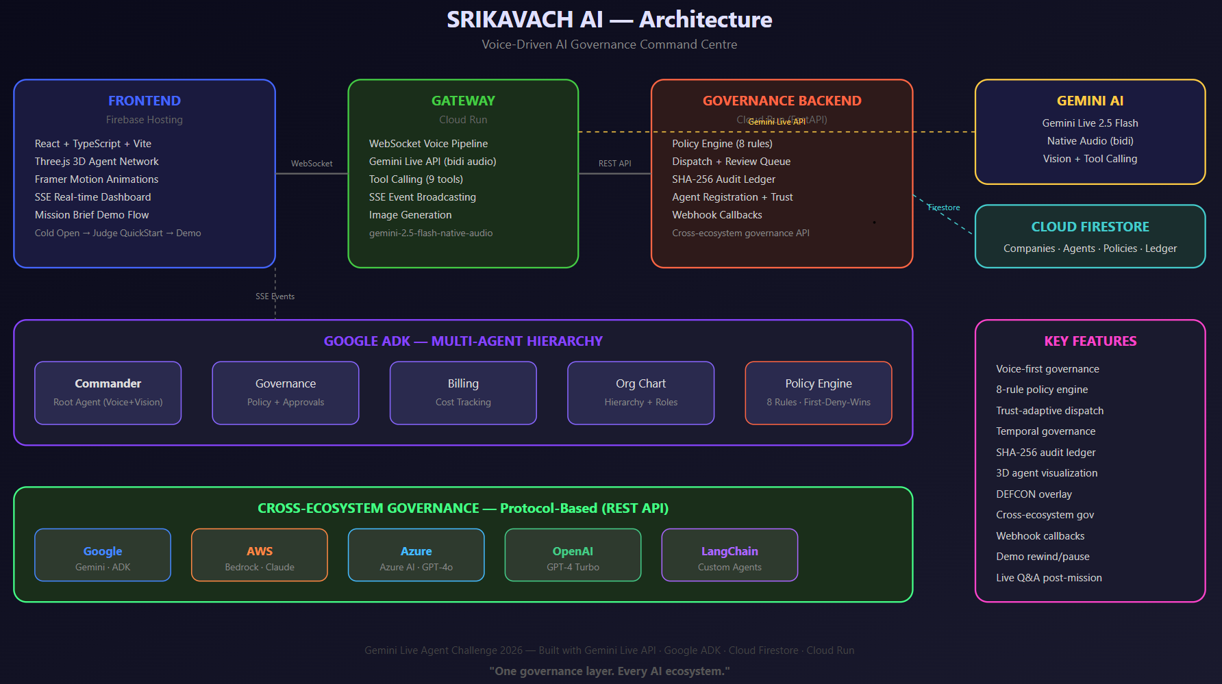 gemini-2.5-flash-native-audio) for real-time two-way audio; gateway WebSocket bridge in Python; 13 tool declarations so the Commander can call governance APIs mid-conversation; barge-in so operators can interrupt and get immediate acknowledgment. - Reasoning & tools — Gemini 2.5 Flash for tool use; Google ADK 4-agent hierarchy (Commander → Governance, Billing, Org sub-agents). Image generation via Gemini 2.5 Flash Image for compliance cards.