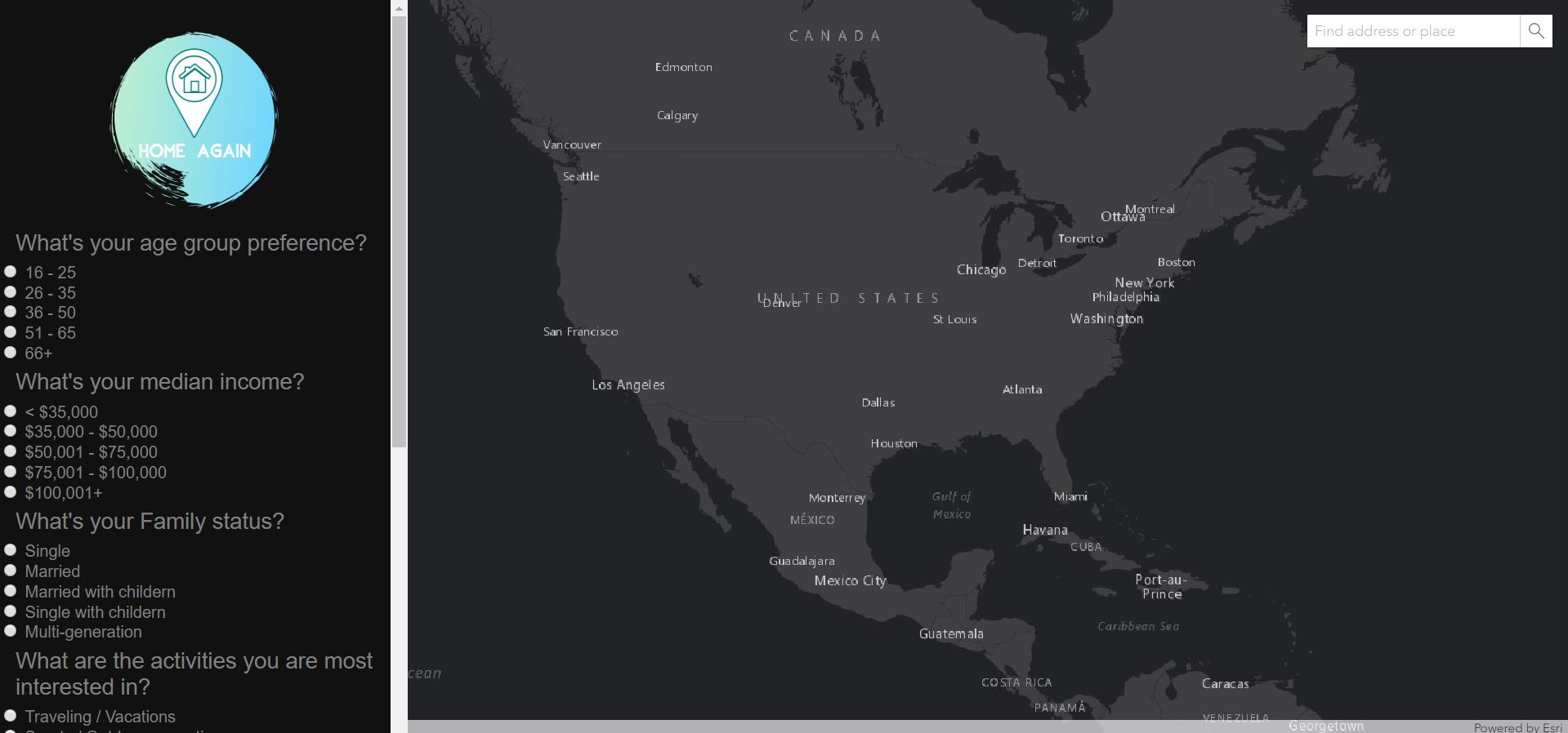 By taking inputs in 4 key categories from the users, Home Again builds a persona around the user. Next, the area/location the user is interested in is segmented based on 4 characteristics. Once this is done, area segments that match the user persona are identified and displayed. This way, user can be well informed that his/her lifestyle choices can be found in the areas that we have identified.